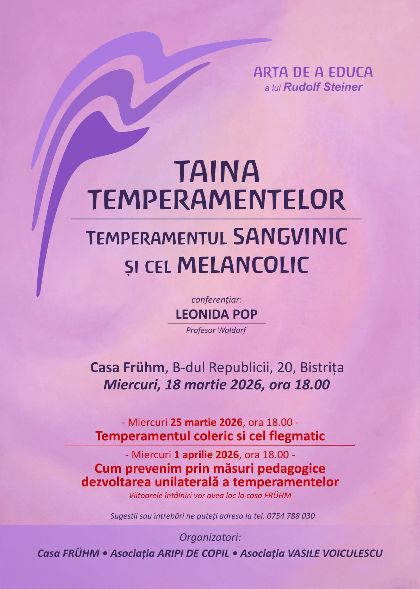 - Miercuri, 25 martie, ora 18.00 – conferință despre Temperamentul coleric si cel flegmatic
