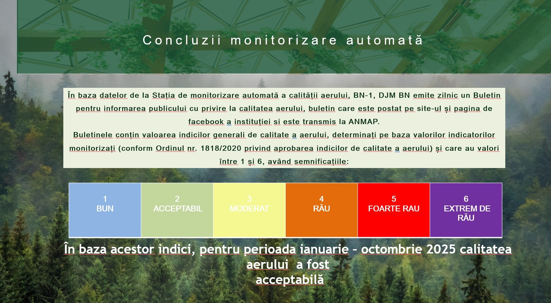 Conform datelor obținute de la Stația BN 1, aerul, în primele 10 luni ale anului a avut calificativul ACCEPTABIL: