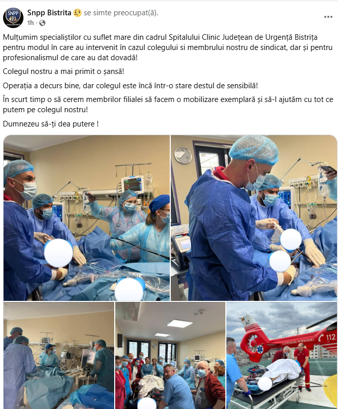 ”Mulțumim specialiștilor cu suflet mare din cadrul Spitalului Clinic Județean de Urgență Bistrița pentru modul în care au intervenit în cazul colegului si membrului nostru de sindicat, dar și pentru profesionalismul de care au dat dovadă!