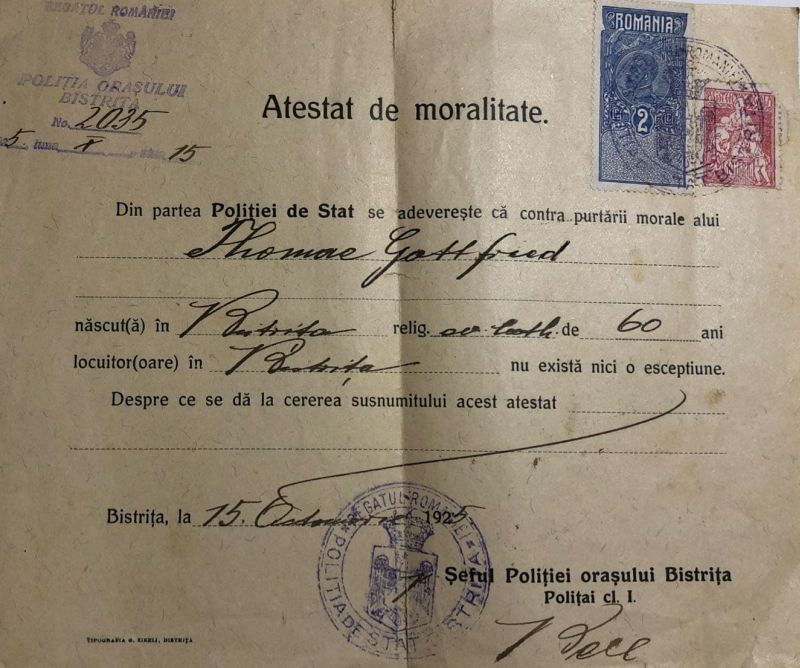 Un colecționar generos ne-a pus la dispoziție un asemenea document care subliniază că „din partea Poliției de stat se adeverește că contra purtării morale a lui Thomae Gottfried, născut în Bistrița, în vârstă de 60 de ani, nu există nicio escepțiune…”