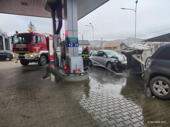 Un apel la 112 anunța azi un accident în stația PECO din Teaca. O mașină a intrat din plin în remorca autoturismului aflat în fața sa, la pompa de alimentare.