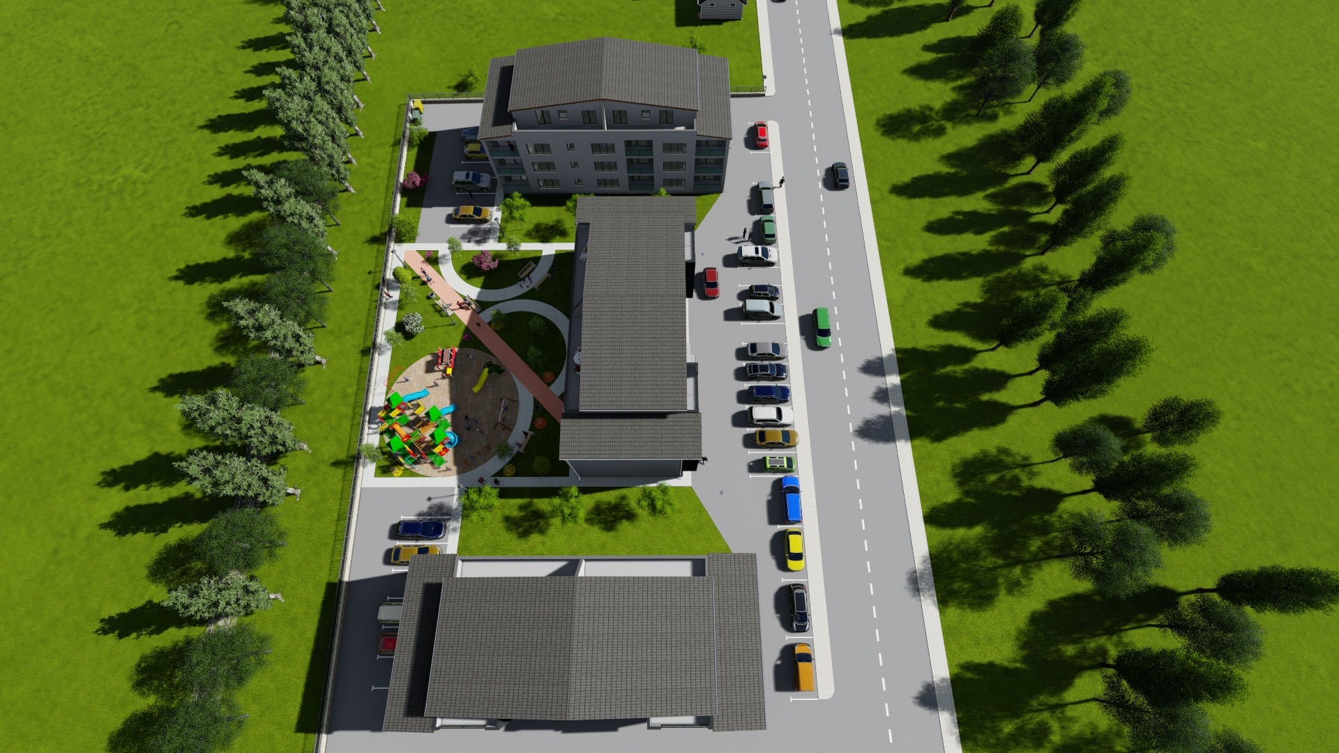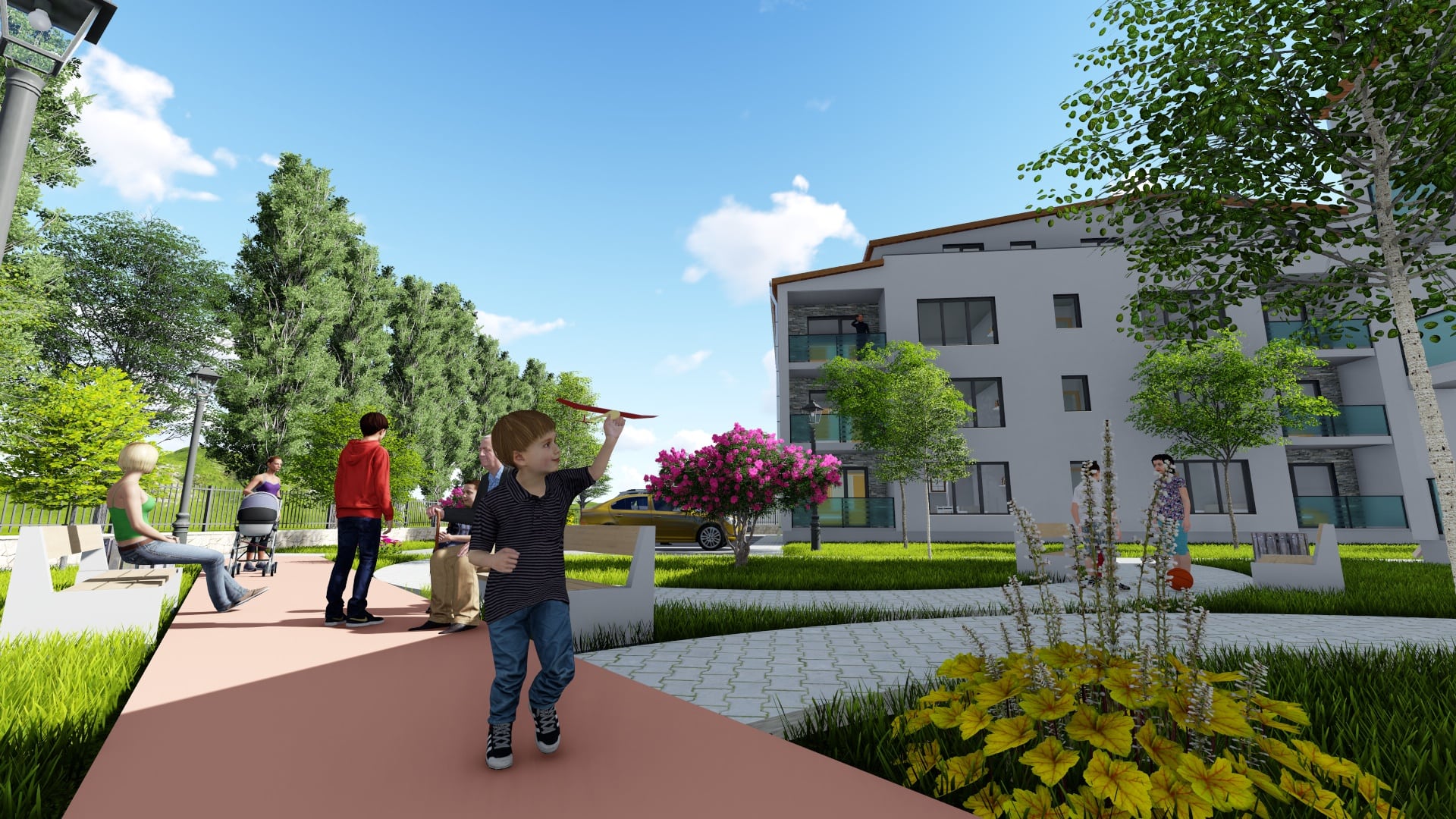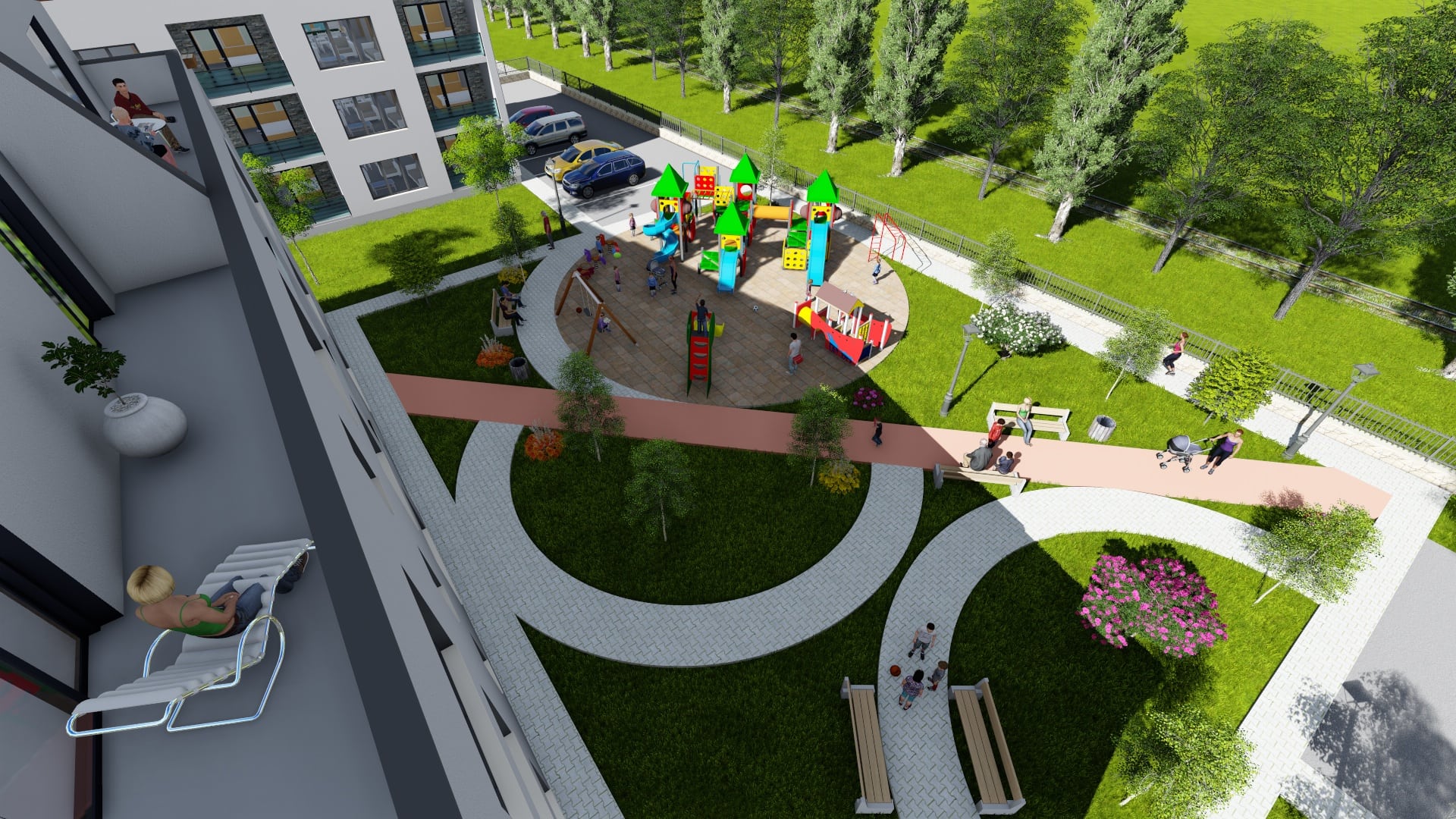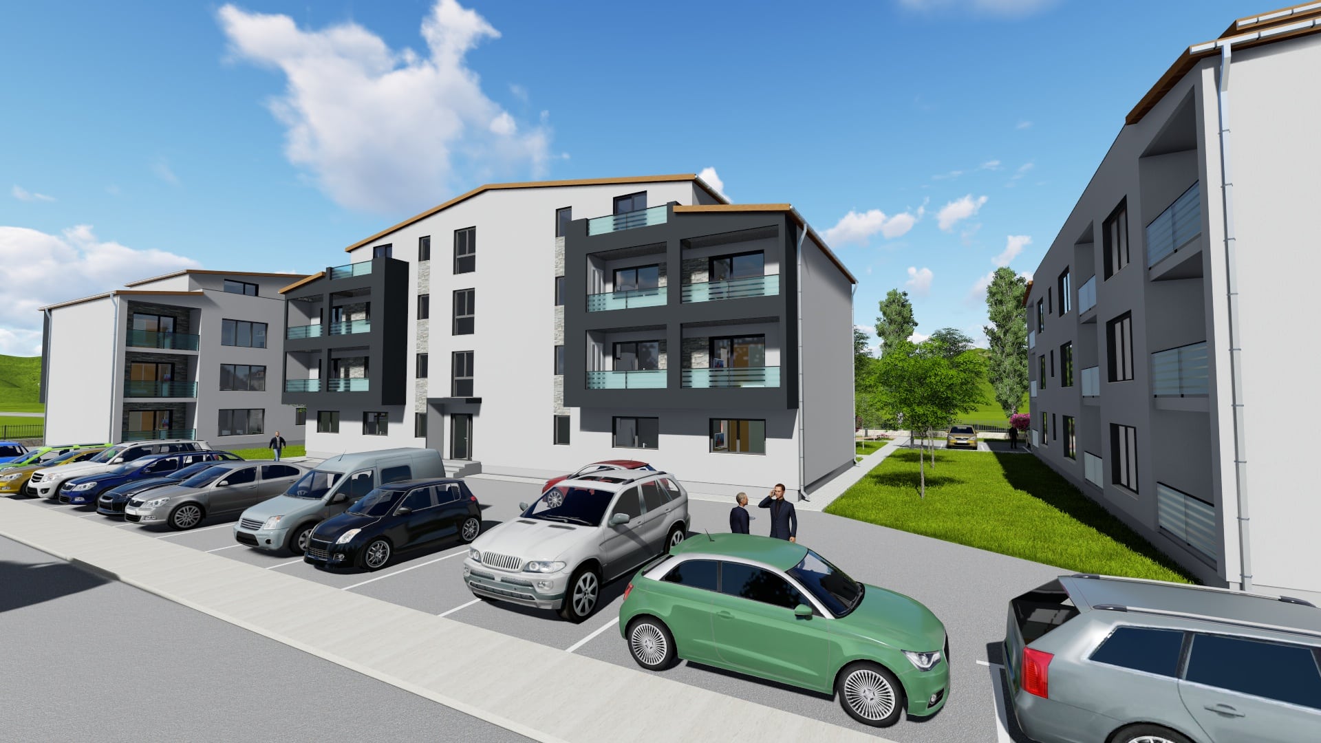 Fiecare apartament va avea un loc de parcare asigurat, iar tot ansamblul rezidențial are parte de o curte generoasă, cu multe spații verzi, unde locatarii să stea cu plăcere.