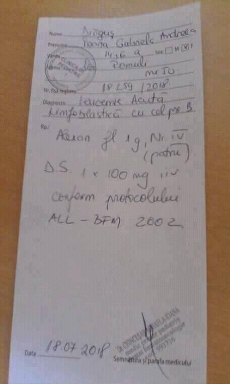 La începutul anului, Andreea acuza dureri în mâini și picioare. După ce a umblat luni de zile pe la doctori, ce o diagnosticau cu „boala creșterii”, în luna mai a venit vestea sumbră: LEUCEMIE! Partea bună e că se poate trata. Asta, dacă noi ne mobilizăm: donând sânge, trombocite sau bani pentru tratament.