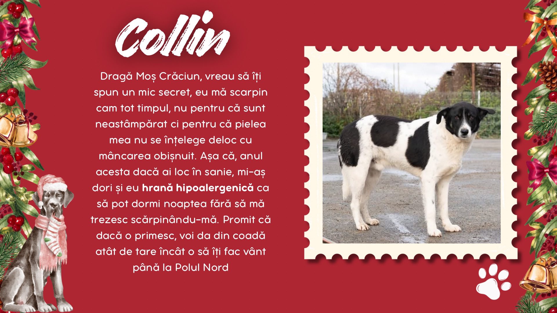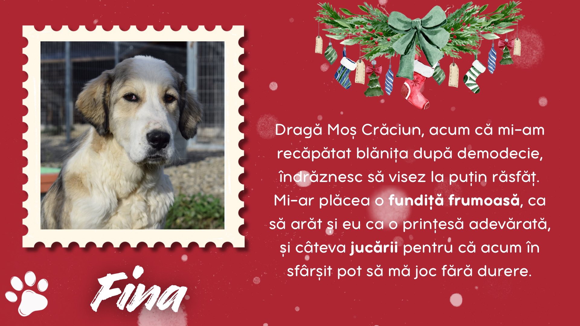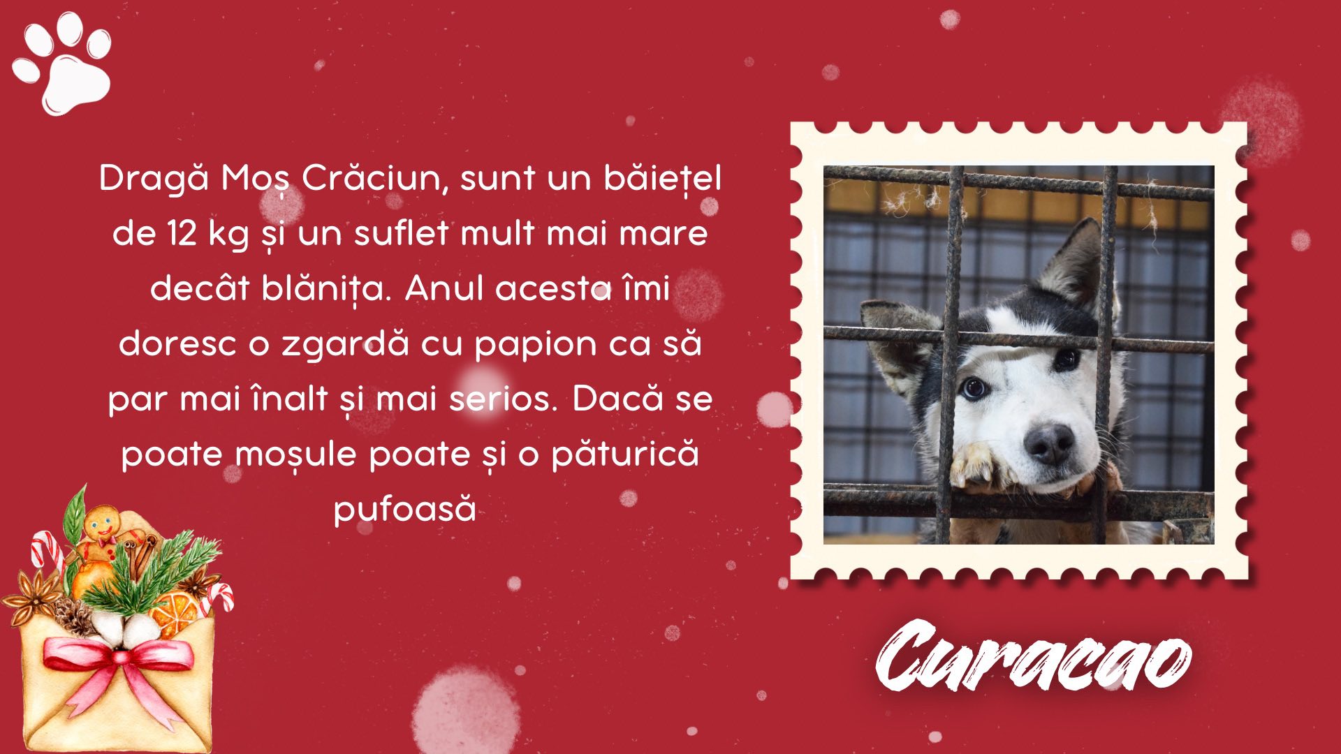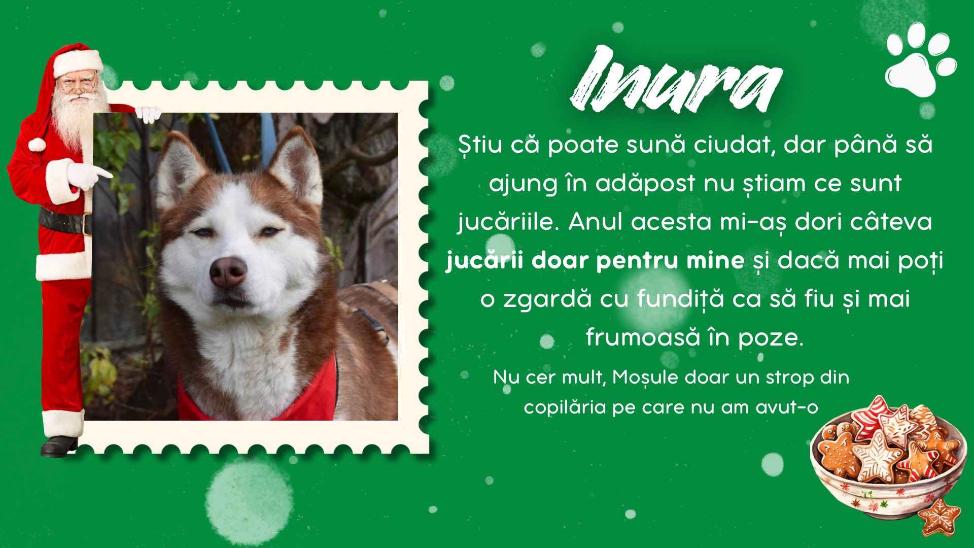 Burga, Inura, Collin, Sărmăluțe, Anouk, Keano, Fina, Piki, Curacao și Ronți sunt câțiva dintre cățeii de la Adăpostul Public Bistrița. Aceștia au scris câte o scrisoare lui Santa Paws, în care i-au spus ce anume își doresc să primească de acest Crăciun.