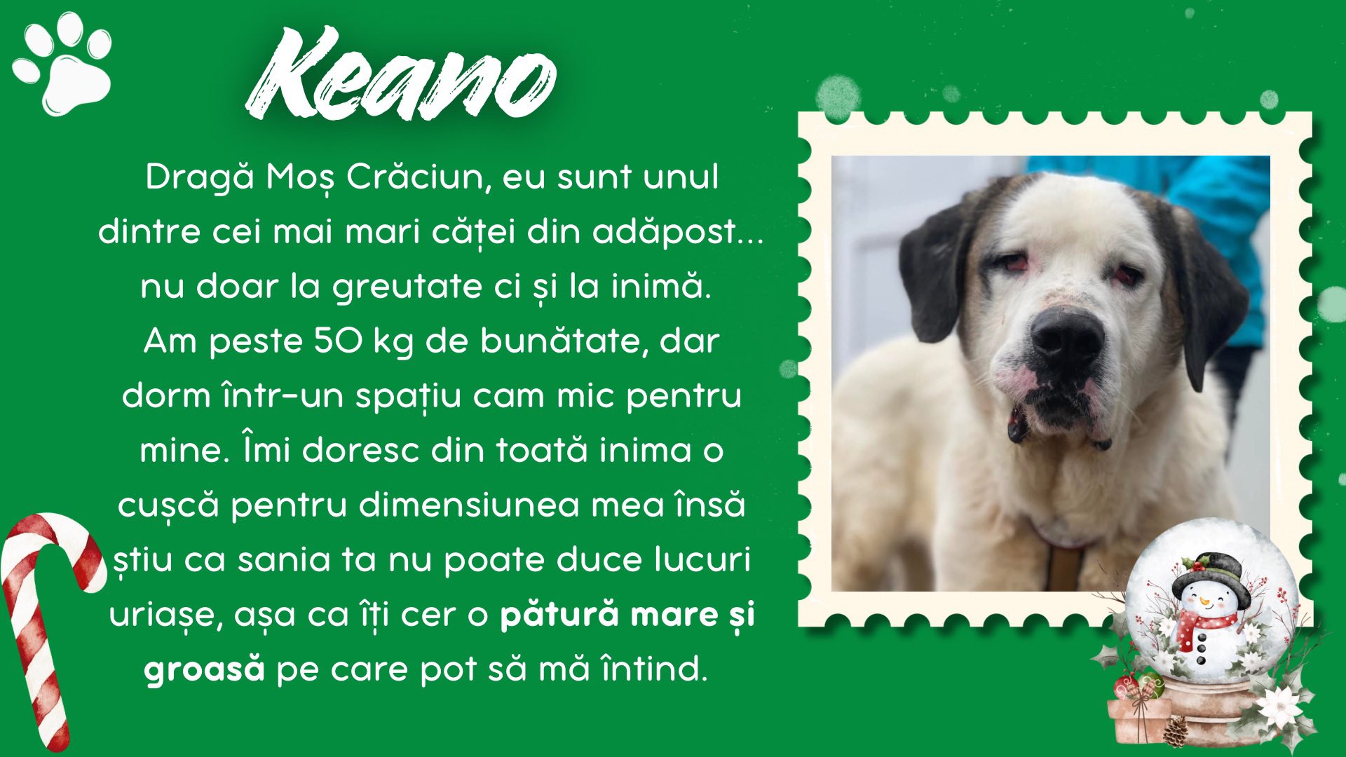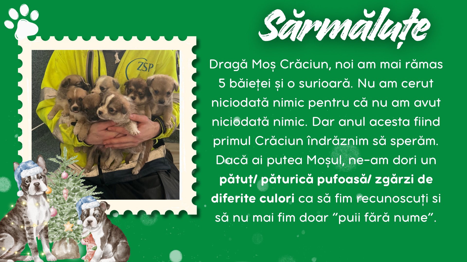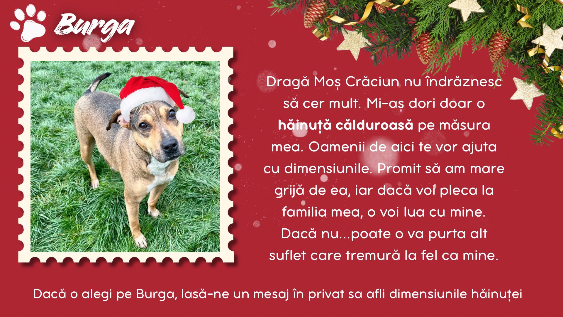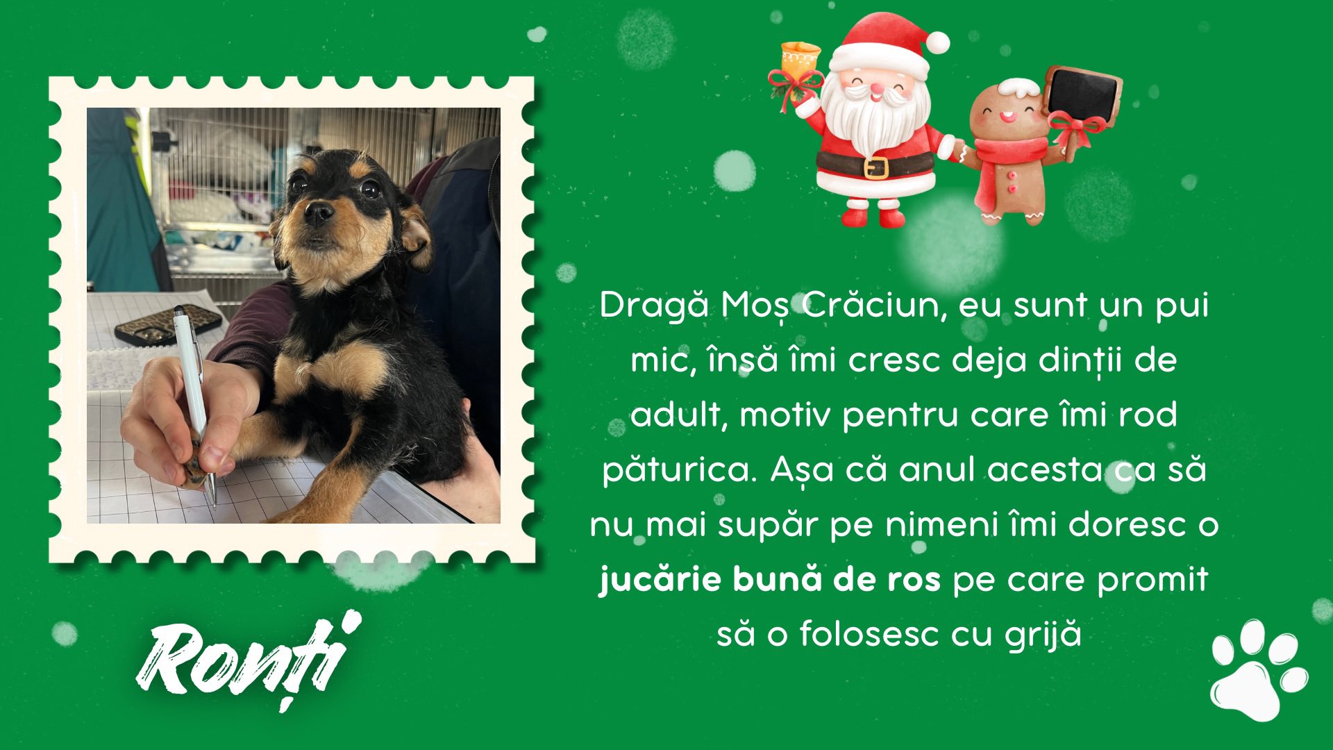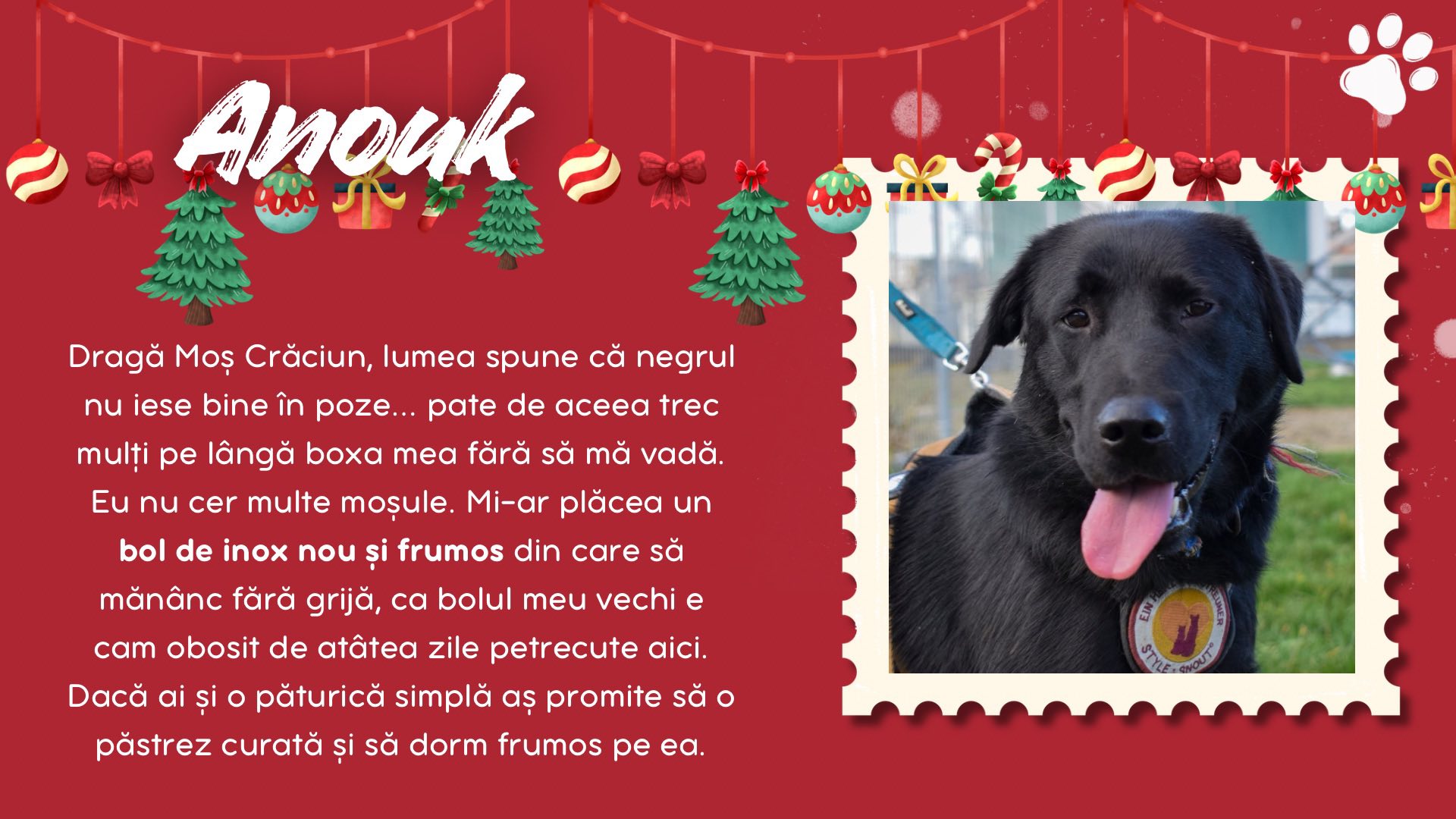 Burga, Inura, Collin, Sărmăluțe, Anouk, Keano, Fina, Piki, Curacao și Ronți sunt câțiva dintre cățeii de la Adăpostul Public Bistrița. Aceștia au scris câte o scrisoare lui Santa Paws, în care i-au spus ce anume își doresc să primească de acest Crăciun.