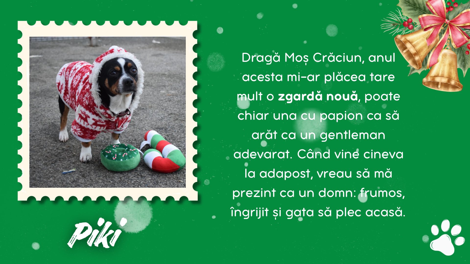 Adăpostul Public Bistrița vine cu o provocare: să fii un Santa Paws. Cățeii de la adăpost au nevoie de hăinuțe, jucării, păturici, hrană, iar tu le poți face codița să se miște de fericire. CE anume poți face: