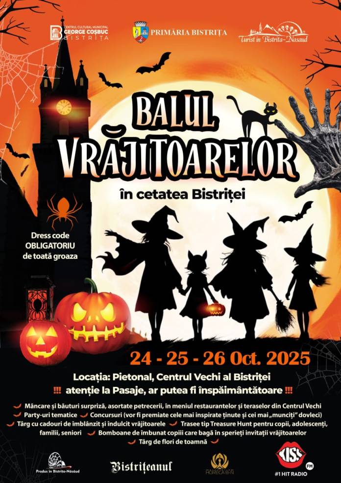 Vrăji bune și magie în lumini calde vor învălui Cetatea Bistrița în perioada 24 – 26 octombrie, când are loc cea de-a treia ediție a mult-așteptatului Bal al Vrăjitoarelor. Organizatorii au pregătit concursuri tematice, cu ținute inspirate și dovleci sculptați, ateliere de creație, un târg cu cadouri lucrate manual și multe alte surprize, pentru toată familia, de la mic la mare.