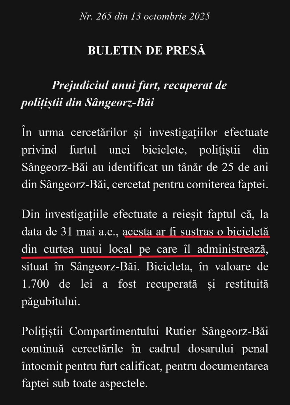 ”În urma cercetărilor și investigațiilor efectuate privind furtul unei biciclete, polițiștii din Sângeorz-Băi au identificat un tânăr de 25 de ani din Sângeorz-Băi, cercetat pentru comiterea faptei.