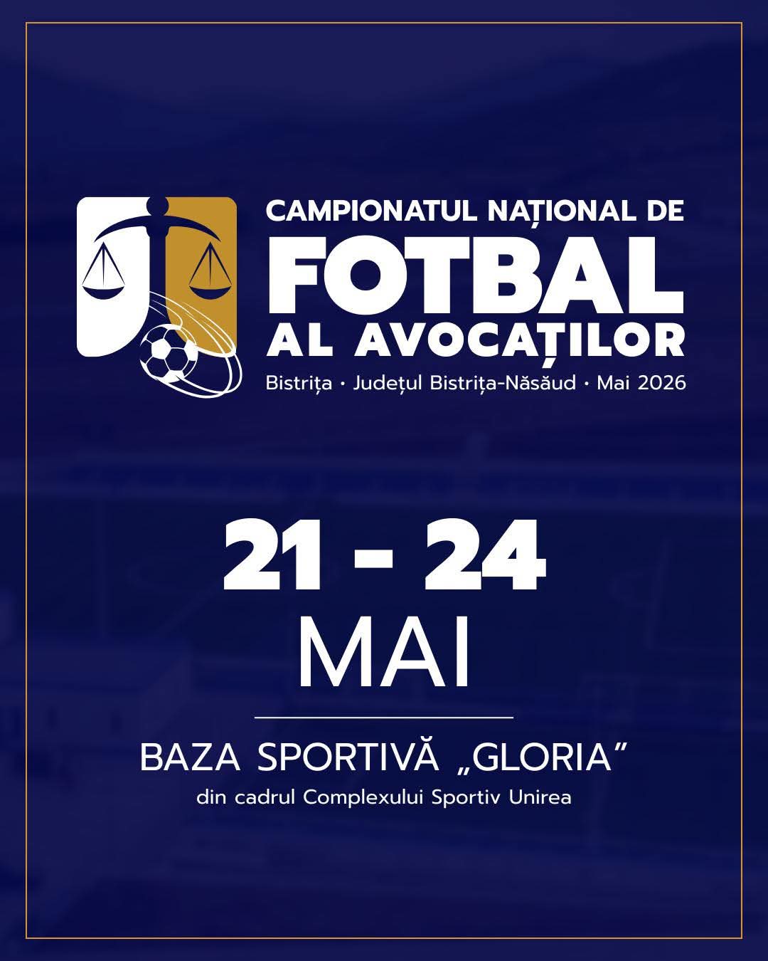 Avocații își lăsa robele deoparte și intră pe teren: primăvara aceasta, Bistrița va fi capitala fotbalului juridic din România! În perioada 21–24 mai, orașul nostru este gazda Campionatului Național de Fotbal al Avocaților – Ediția 2026, eveniment organizat de Baroul Bistrița-Năsăud.