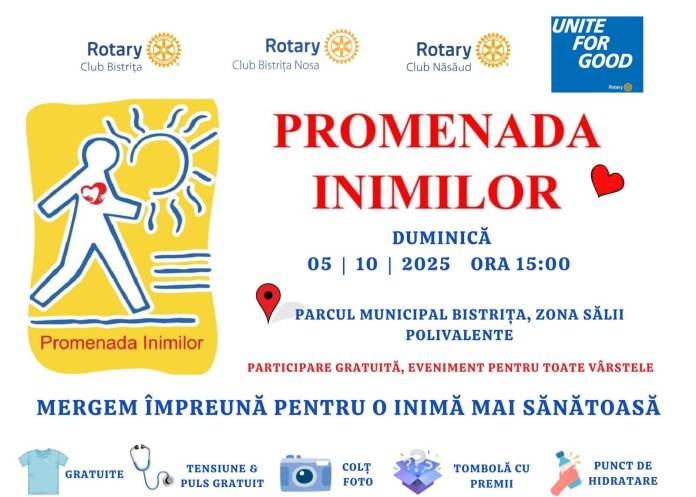 Promenada inimilor are loc mâine, 5 octombrie, de la ora 15.00, în parcul municipal din Bistrița. Este vorba despre un eveniment cu caracter sportiv, organizat de Cluburile Rotary Bistrița, Rotary Bistrița Nosa și Rotary Năsăud. Sunt așteptați toți bistrițenii, indiferent de vârstă.