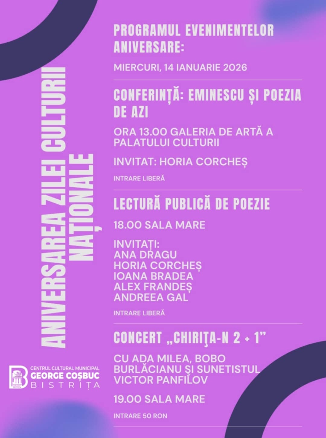Centrul Cultural Municipal George Coşbuc şi Primăria Bistriţa celebrează Ziua Culturii Naționale oferind publicului un savuros spectacol muzical – teatral. Protagoniști sunt Ada Milea și Bobo Burlăcenu.