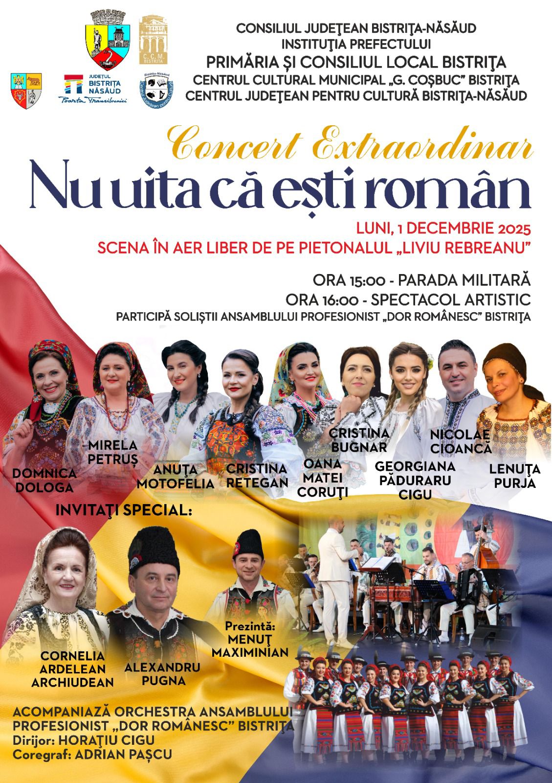 Primăria Bistrița a transmis că artiștii Ansamblului folcloric profesionist „Dor Românesc” vor urca pe scena amplasată pe Pietonalul Liviu Rebreanu la ora 16.00.