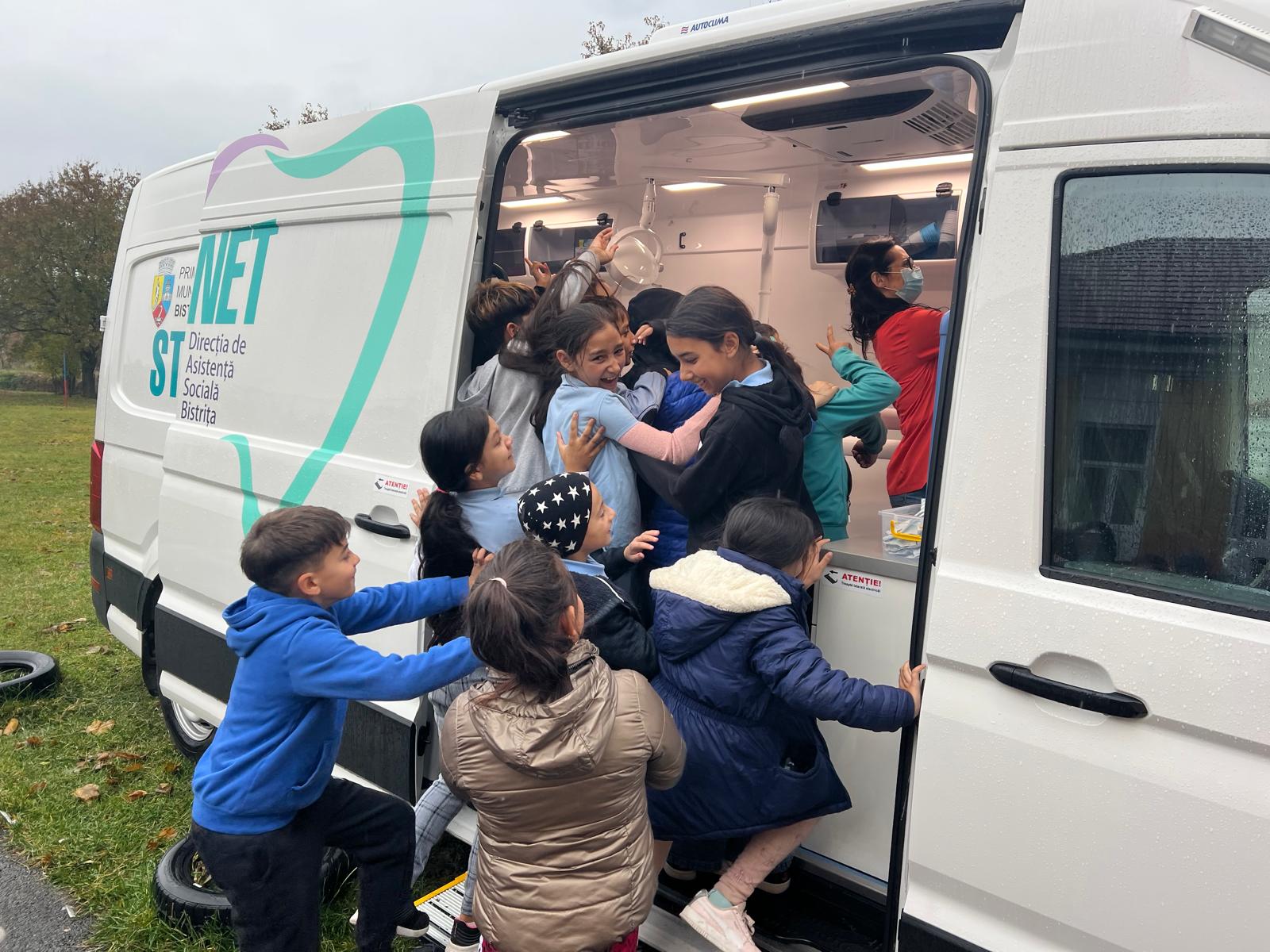 Până acum, cabinetul stomatologic mobil a ajuns la școlile din cartierele Bistriței care nu doar că nu sunt arondate unui cabinet stomatologic școlar, ci includ și mulți școlari și preșcolari care provin din familii cu situații materiale dificile.