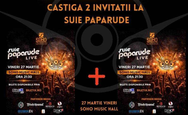 Șuie Paparude va concerta în premieră la Bistrița, vineri, 27 martie, în Soho Music Hall. Se anunță un show de zile mari, cu beat-uri iconice și multă energie, iar Bistrițeanul.ro și Soho Music Hall oferă fanilor din oraș două invitații gratuite! Ce trebuie să faci ca să le primești: