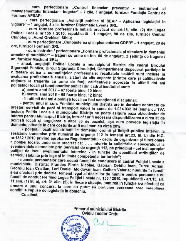 Primarul Ovidiu Creţu subliniază şi faptul că în ultimii doi ani de zile, 11 angajați ai Poliției locale Bistrița au urmat cursuri de perfecționare: