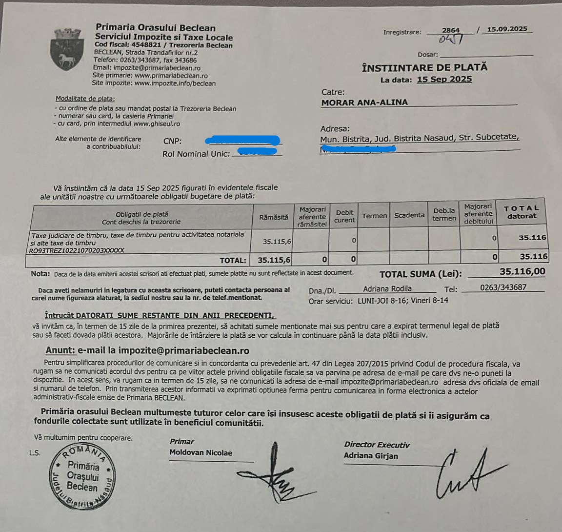 Ba îmi tot trimit tot felul de amenzi de plătit. Și acum, am primit o înștiințare din partea Primăriei Beclean să plătesc 7.000 de euro taxe pentru casa la care eu am renunțat la partaj. Cum să plătesc pentru ceva ce nu am? Plus că au trimis înștiințarea la o adresă greșită, ca să se asigure că eu nu văd și astfel să mă poată da în instanță…simt că înnebunesc!” a povestit, pentru ziarul local Bistrițeanul.ro, Alina Morar (Onoaie, ca fată).