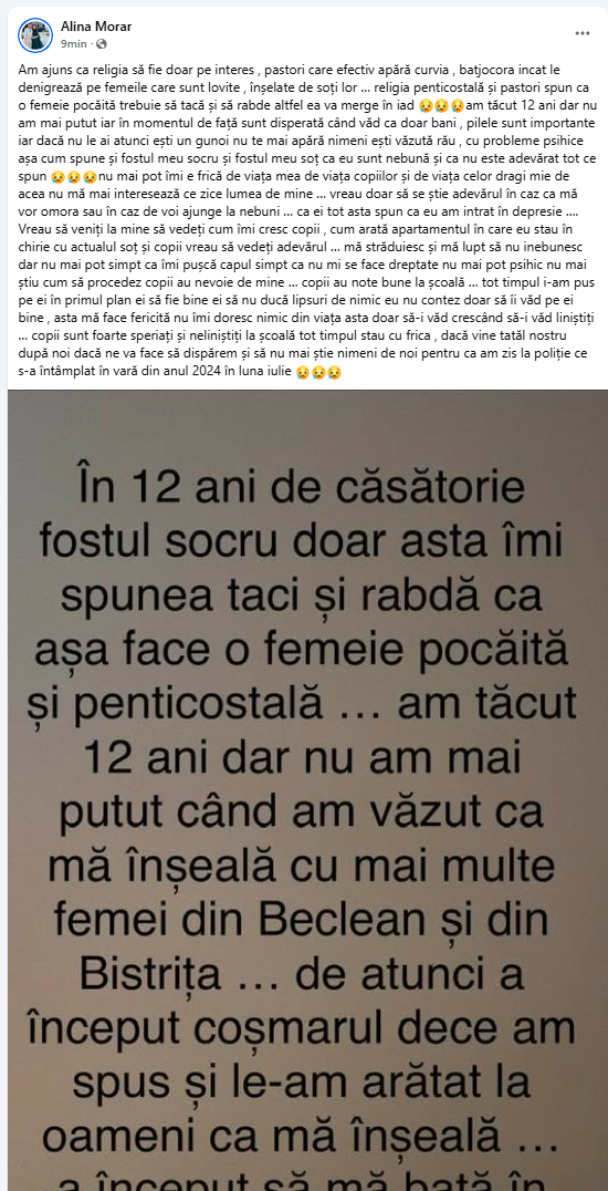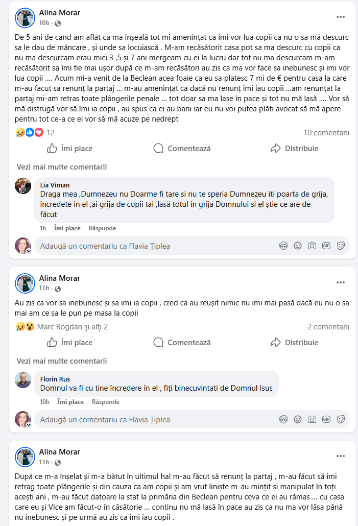 Eu vreau liniște și vreau să știe toată lumea ce mi-au făcut și de ce sunt ei în stare. Nu mă mai interesează cine, ce spune. Eu știu de ce sunt ei în stare și nu mai pot așa!” a concluzionat Alina Morar.