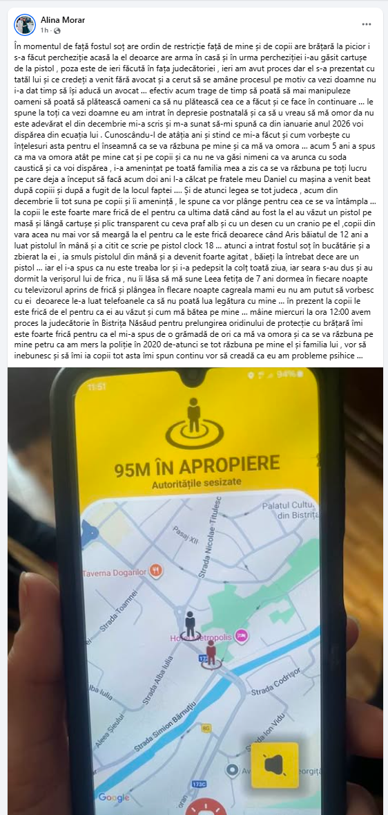 Le spune tuturor că eu am intrat în depresie postnatală și că vreau să mă omor, dar nu este adevărat. El din decembrie mi-a scris și m-a sunat să-mi spună că din ianuarie anul 2026 voi dispărea din ecuația lui. Atunci, cu amenințările respective, am cerut ordin de protecție, și chiar au auzit polițiștii cum vorbea cu copiii la telefon, că i-a sunat.