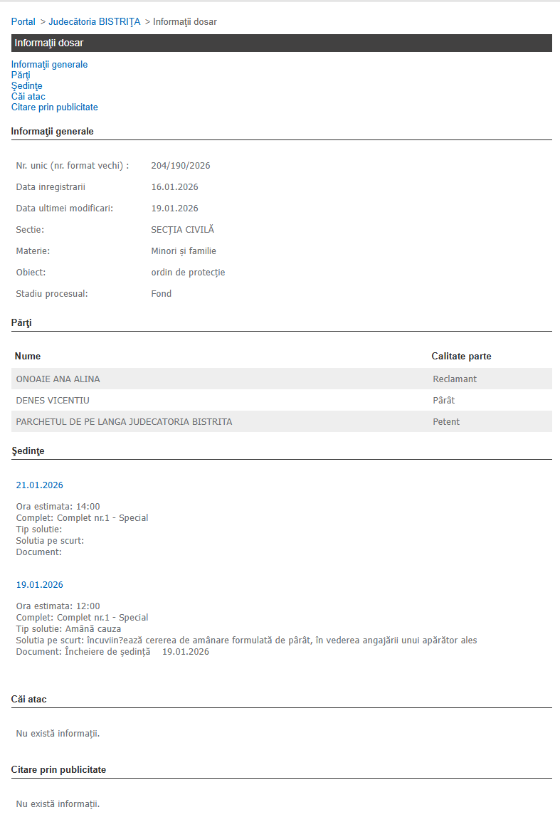 Astfel, ieri, 19 ianuarie 2026, Vicențiu și Alina s-au întâlnit la Judecătoria Bistrița pentru procedura necesară. Doar că Vicențiu a cerut instanței să amâne decizia până mâine, ca să aibă timp să își ia un avocat.