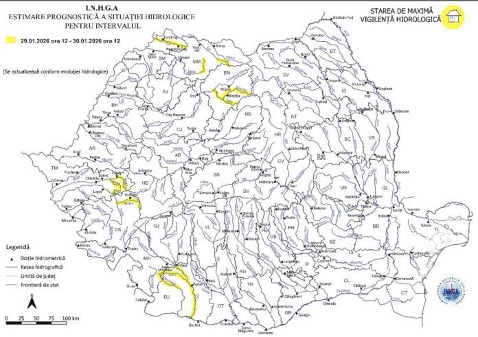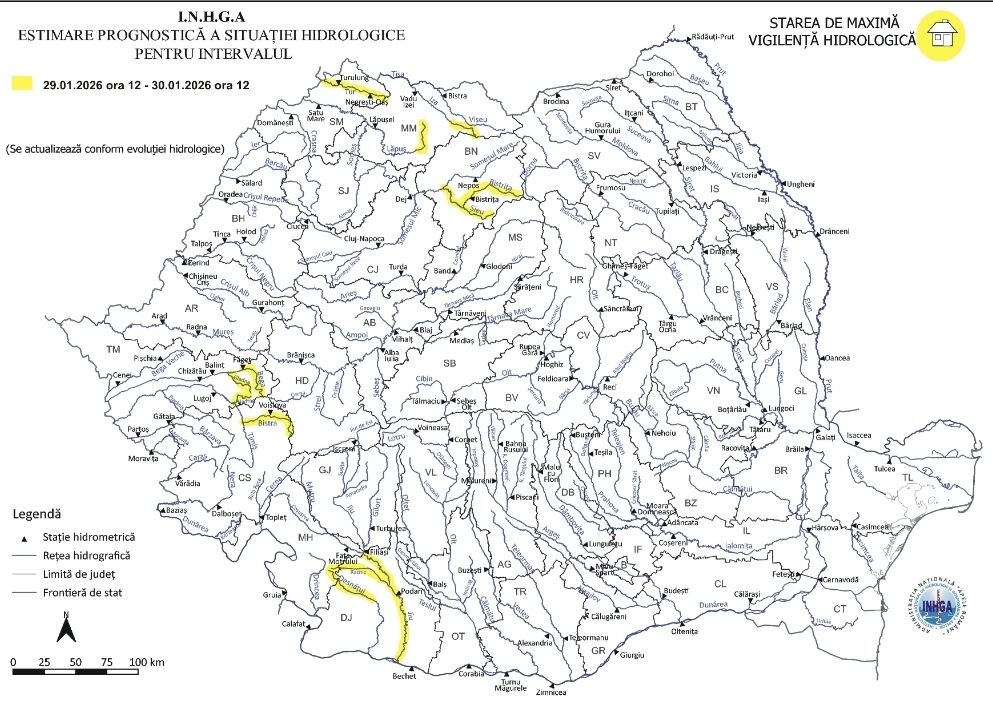Autoritățile au emis o avertizare de Cod Galben valabilă pentru intervalul 29 ianuarie, ora 12:00 – 30 ianuarie, ora 12:00. Sunt vizate creșteri importante de debite și niveluri, cauzate de propagarea viiturilor formate în amonte sau de evoluția formațiunilor de gheață. Există riscul depășirii COTELOR DE ATENȚIE pe mai multe râuri din diferite zone din țară, printre care și Bistrița-Năsăud.