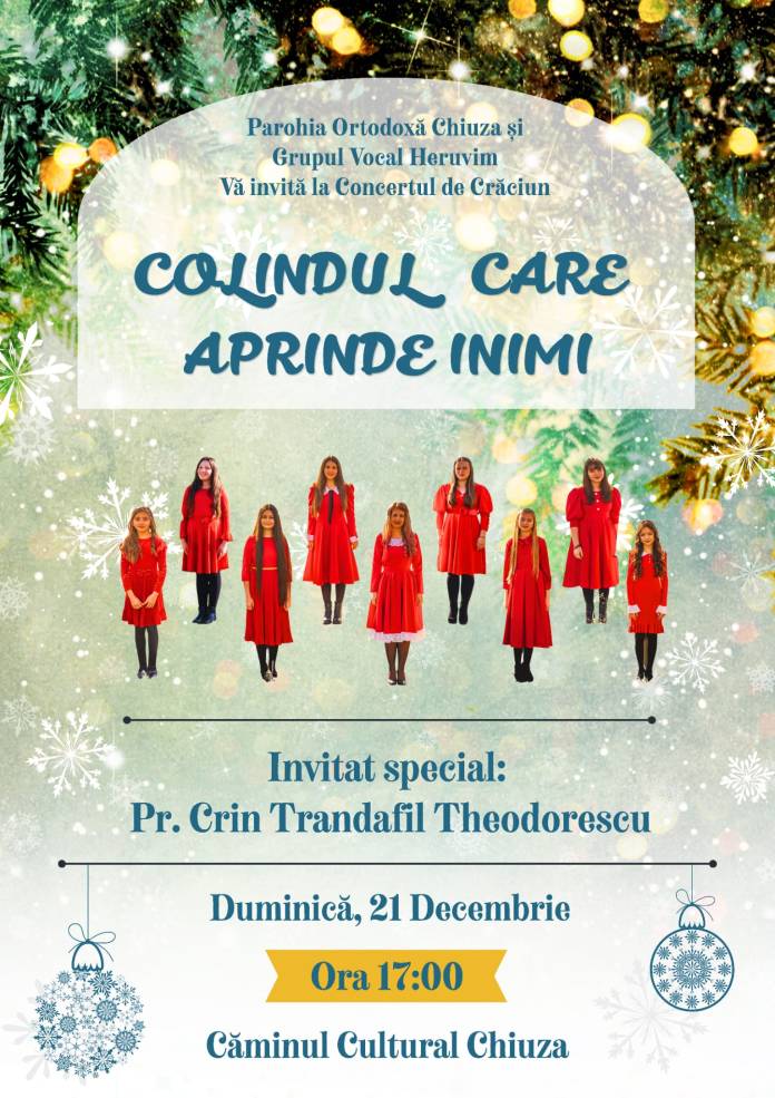 Parohia Ortodoxă Chiuza și talentatul Grup Vocal „Heruvim” vă invită duminică la un concert de colinde deosebit, menit să aducă spiritul autentic al Crăciunului în sufletele tuturor. Invitatul special al serii va fi părintele Crin-Triandafil Theodorescu.
