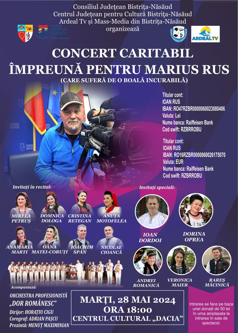 În acest sens, suntem cu toții invitați marți, 28 mai 2024, la Centrul cultural Dacia din Bistrița. Aici se desfășoară un concert caritabil: Împreună pentru Marius Rus.