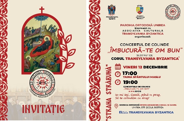 Concertul de colinde susținut de corul Transylvania Byzantica Îmbucură-te om bun” se desfăşoară vineri, 12 decembrie, de la ora 19:00, la Biserica ortodoxă din Unirea de pe str. Şcolii.
