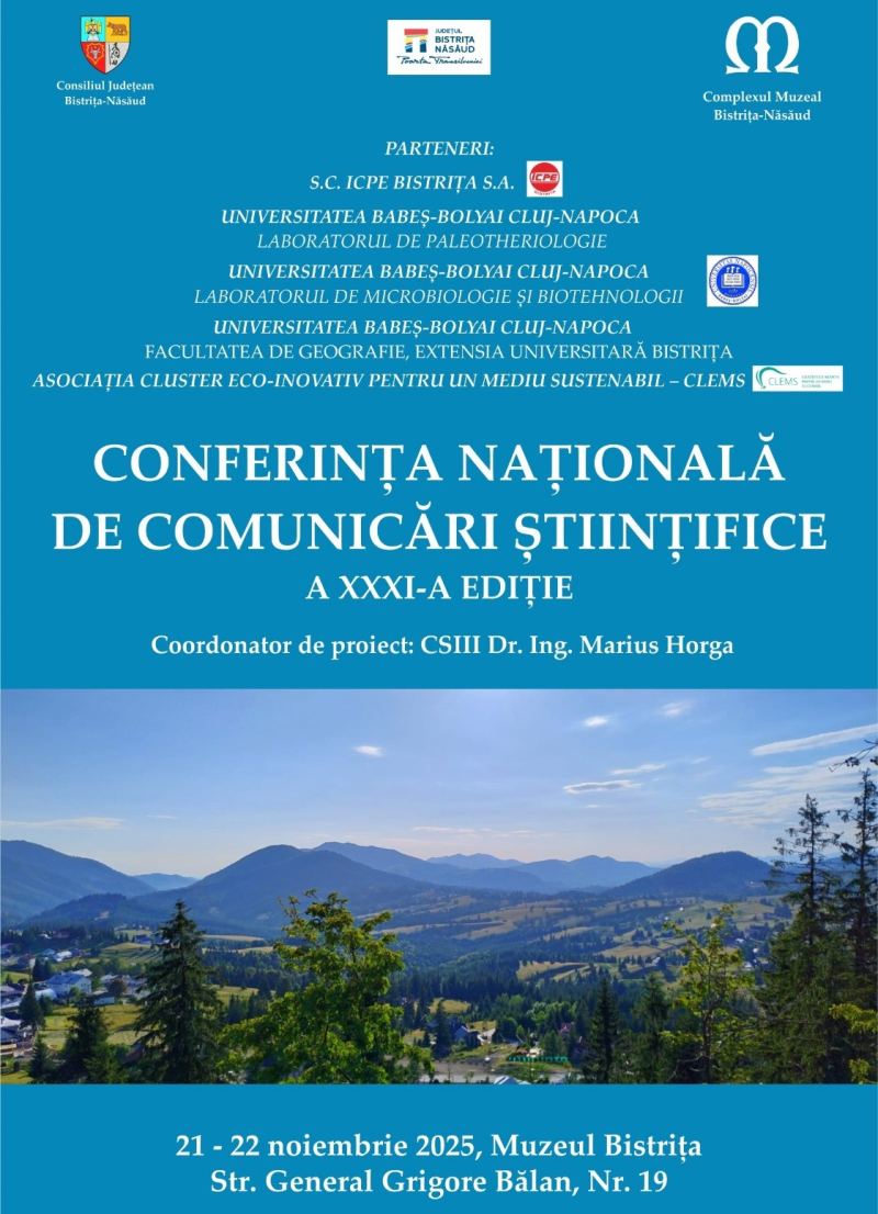 Conferința Națională de Comunicări Științifice coordonată de Secţia de Ştiinţele Naturii a ajuns la ediția cu numărul 31. Tradiționala manifestare științifică se desfășoară în 21 și 22 noiembrie 2025, începând cu ora 10.30, la Muzeul Județean din Bistrița. Evenimentul este structurat pe două secţiuni: Geologie-Geografie și Biologie.