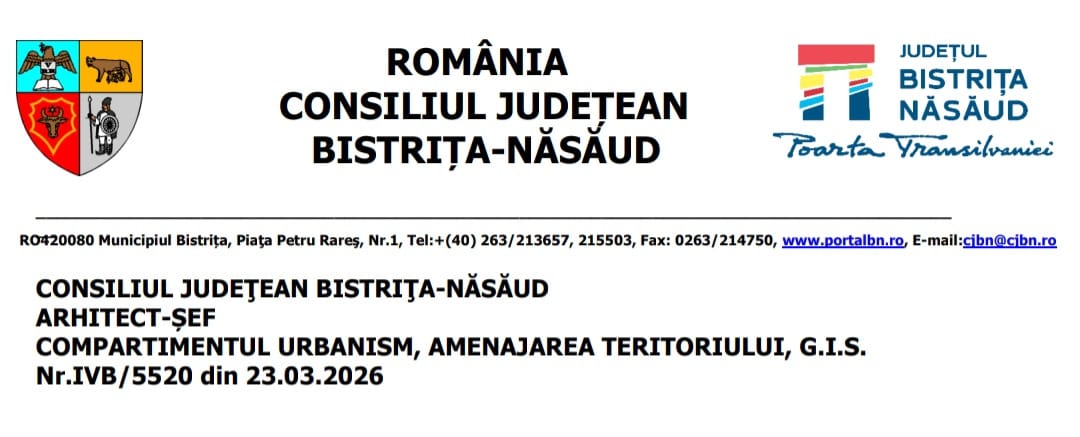 Direcția Județeană de Mediu Bistrița-Năsăud anunță publicul interesat despre decizia finală pentru Planul – „Plan de amenajare a teritoriului județean Bistrița-Năsăud”, amplasat pe raza județului Bistrița-Năsăud, titular: CONSILIUL JUDEȚEAN BISTRIȚA-NĂSĂUD;