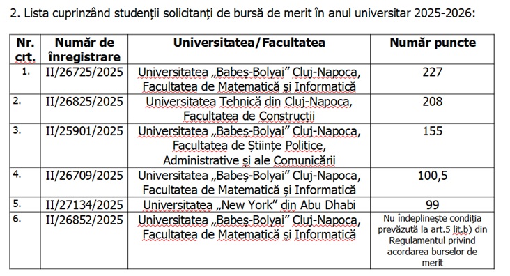 3. Lista cuprinzând studenții, aflați în plată, care sunt eligibili pentru menținerea bursei de merit și în anul universitar 2025-2026: