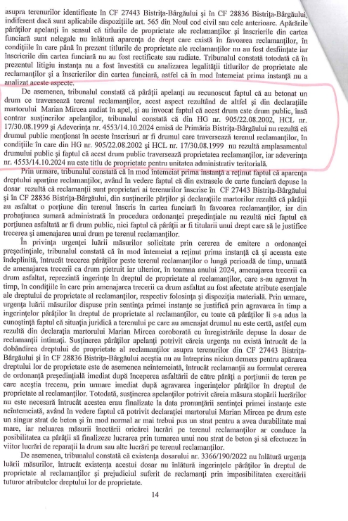 Persoane care dețin în amonte imobile, fără acordul meu expres, cu avizul autorităților locale, au pătruns pe teritoriul subsemnatului și au încercat să edifice „pe furiș” un drum betonat, pretinzând că este un traseu stabilit de autoritatea locală, însă în urma unor petiții adresate de subsemnatul Judecătoriei Bistrița, obiect al dosarelor nr. 10347/190/2024 respectiv 10346/190/2024, instanța s-a pronunțat, asupra existenței în proprietatea mea a terenului folosit cu titlu de drum. Mai mult, Tribunalul Bistrița-Năsăud, prin Decizia civilă nr. 11/2025 a statuat în mod definitiv, că subsemnatul alături de familia mea, mă pot bucura de dreptul de proprietate înscris în CF și că „contrar susținerilor apelanților” ( cum că drumul blocat ar fi unul public) Tribunalul constată că din HG 905/22.08.2002, HCL 17 din 30.08.1999 și Adeverința nr. 4553/14.10.2024 emisă de Primăria Bistrița-Bârgăului nu rezultă că drumul public menționat în aceste înscrisuri ar fi drumul care traversează terenul subsemnatului, în condițiile în care din HG 905/22.08.2002, HCL 17 din 30.08.1999 nu rezultă amplasamentul drumului public și faptul că acest drum public traversează proprietatea subsemnatului.