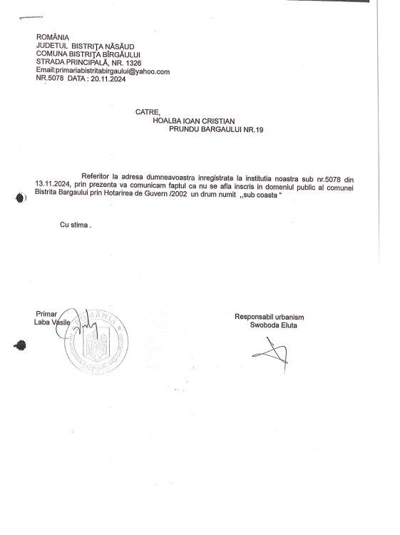 „Observând știrea publicată în data de 03.02.2025 în urma căreia subsemnatul HOALBA IOAN CRISTIAN, domiciliat în Prundu Bârgăului, strada Primăverii, nr.19, jud. BN, căsătorit, am fost acuzat de un număr mare de persoane din localitatea Colibița că aș fi închis în mod voit un drum de acces, vă solicit să aduceți următoarele clarificări și să înștiințați opinia publică că imobilul pe care a fost depozitată piatra de stâncă este o proprietate privată a subsemnatului și, conform art. 555 cod civil, pot beneficia de fiecare atribut conferit proprietarului înscris în CF.