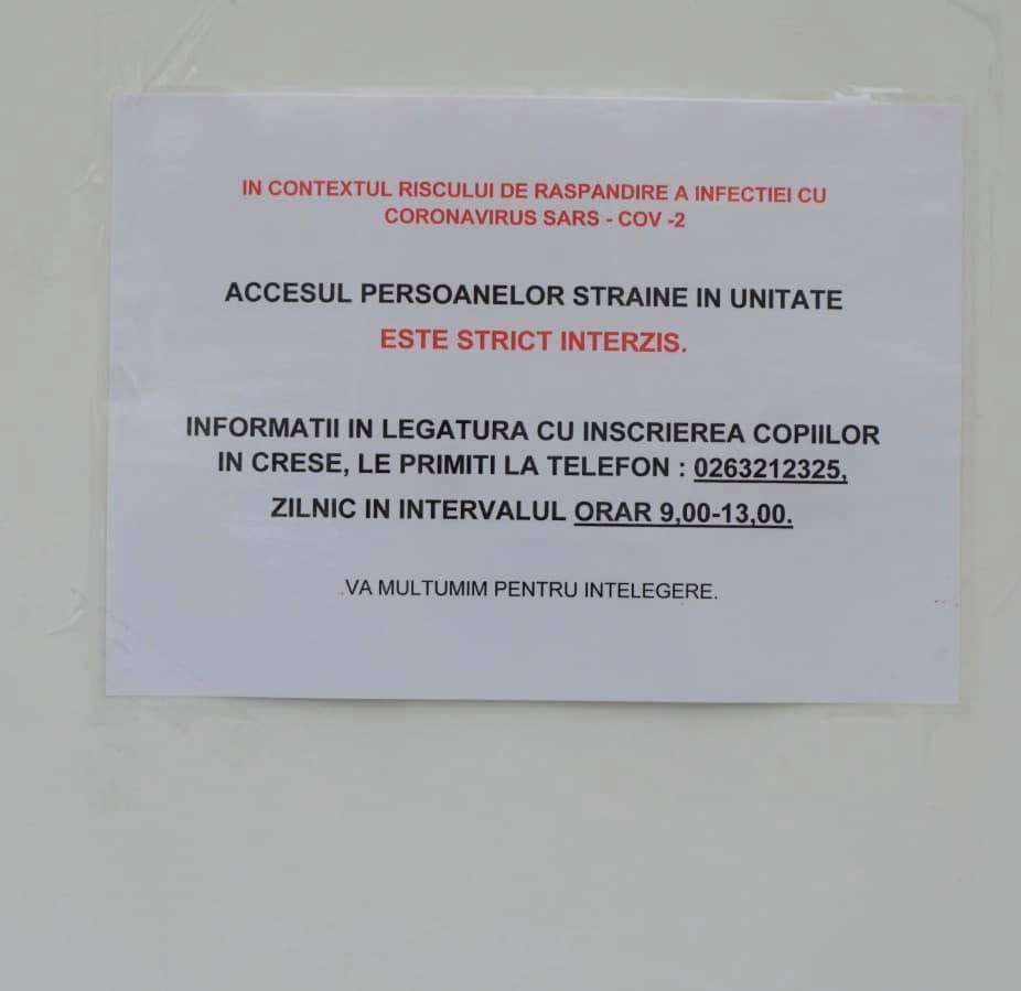 • având în vedere închiderea creșelor, relaționarea cu publicul se realizeză telefonic, la numărul 0263.212.325, zilnic, în intervalul 09.00 – 13.00.