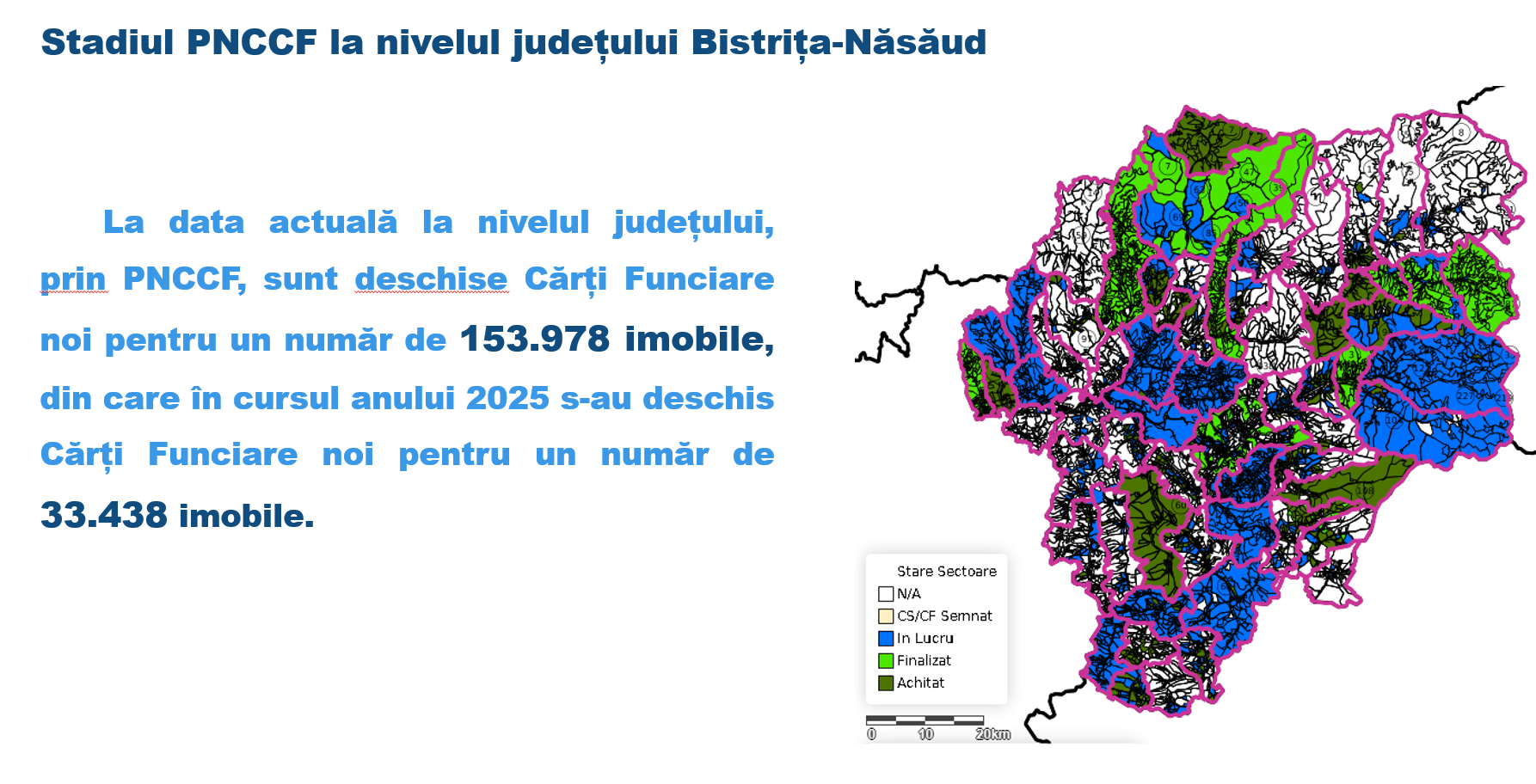 Județul nostru, în ceea ce privește înscrierile în cărțile funciare, se află undeva la mijloc, comparativ cu situația națională. Conform hărții, ce e cu alastru sunt zonele unde s-a finalizat cadastrarea, cele cu roz sunt în curs de cadastrare, în derulare. Iar cele albe sunt zone care acum contractează, acum se pregătesc…” a declarat Daniel Lucian Grigore.