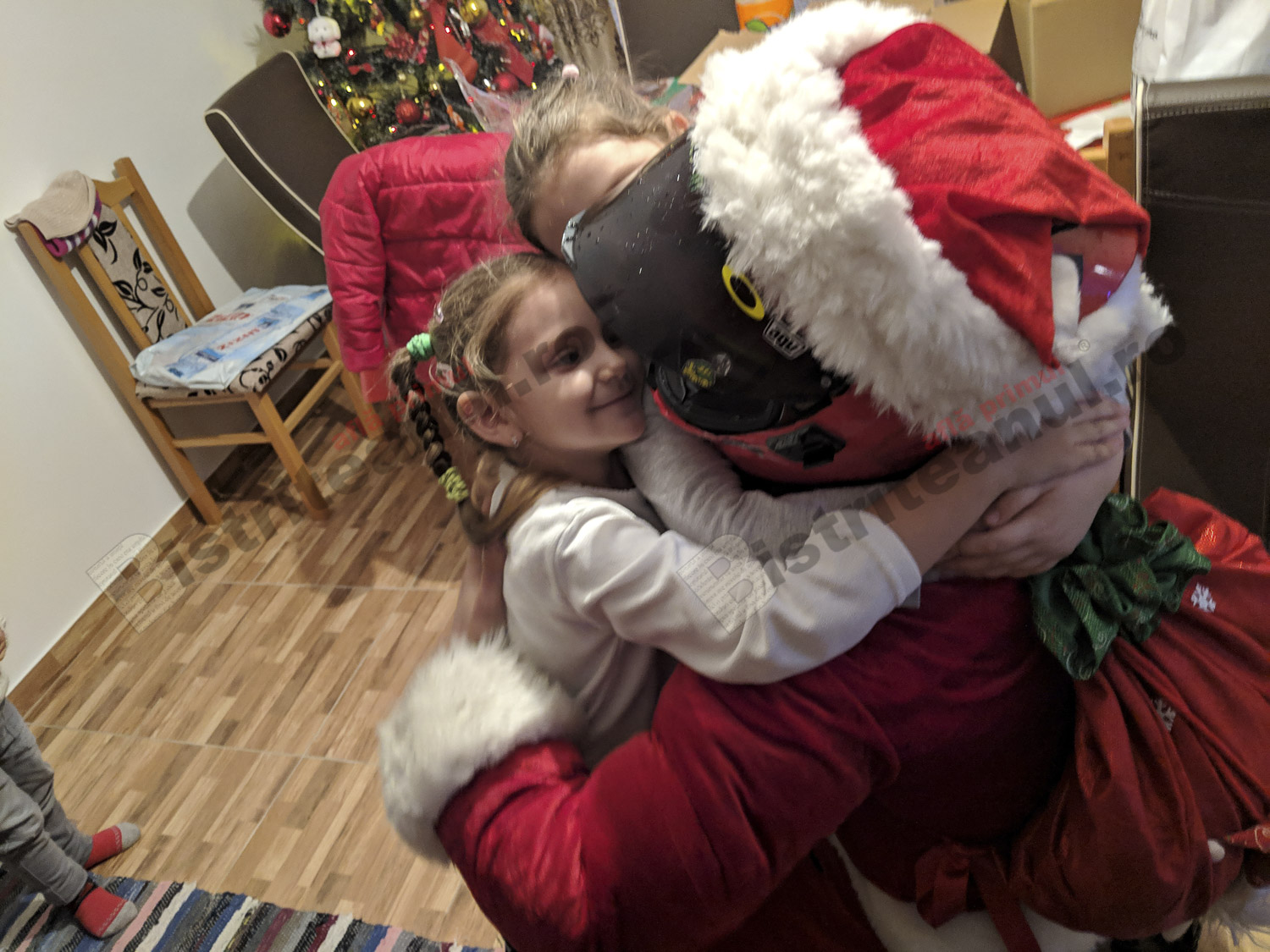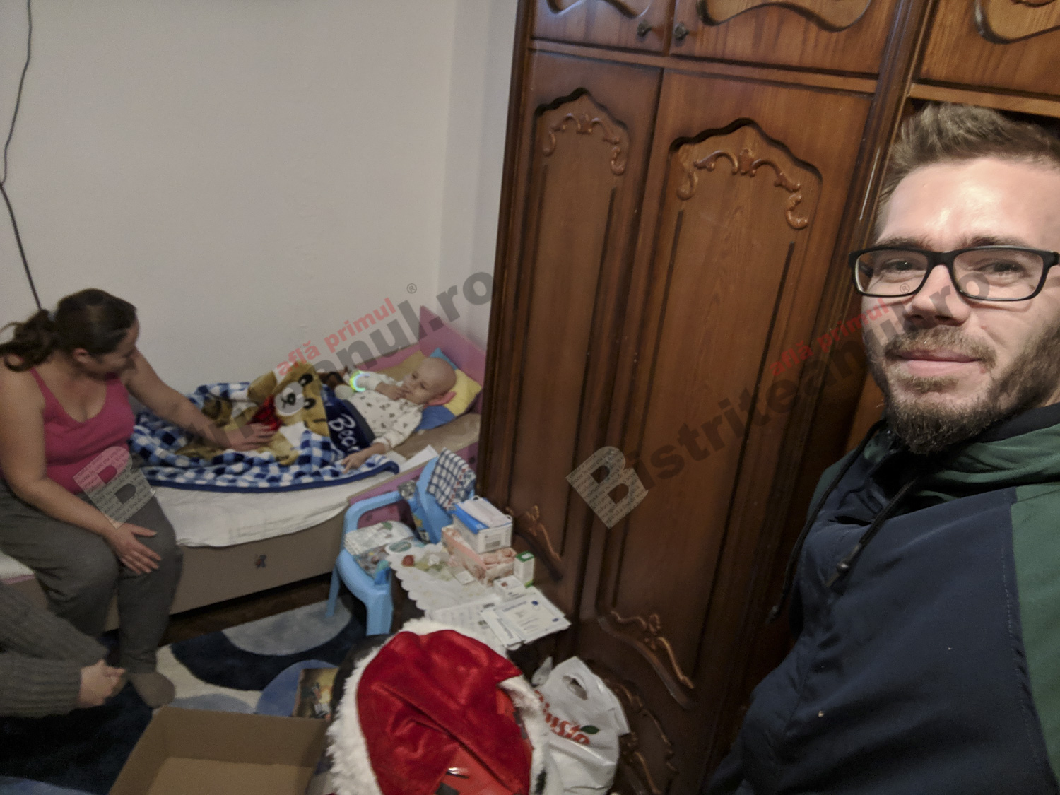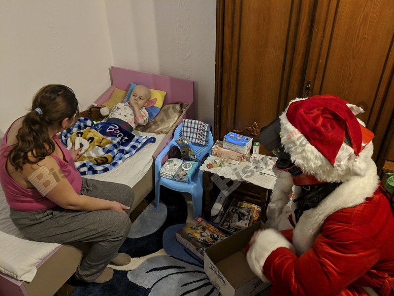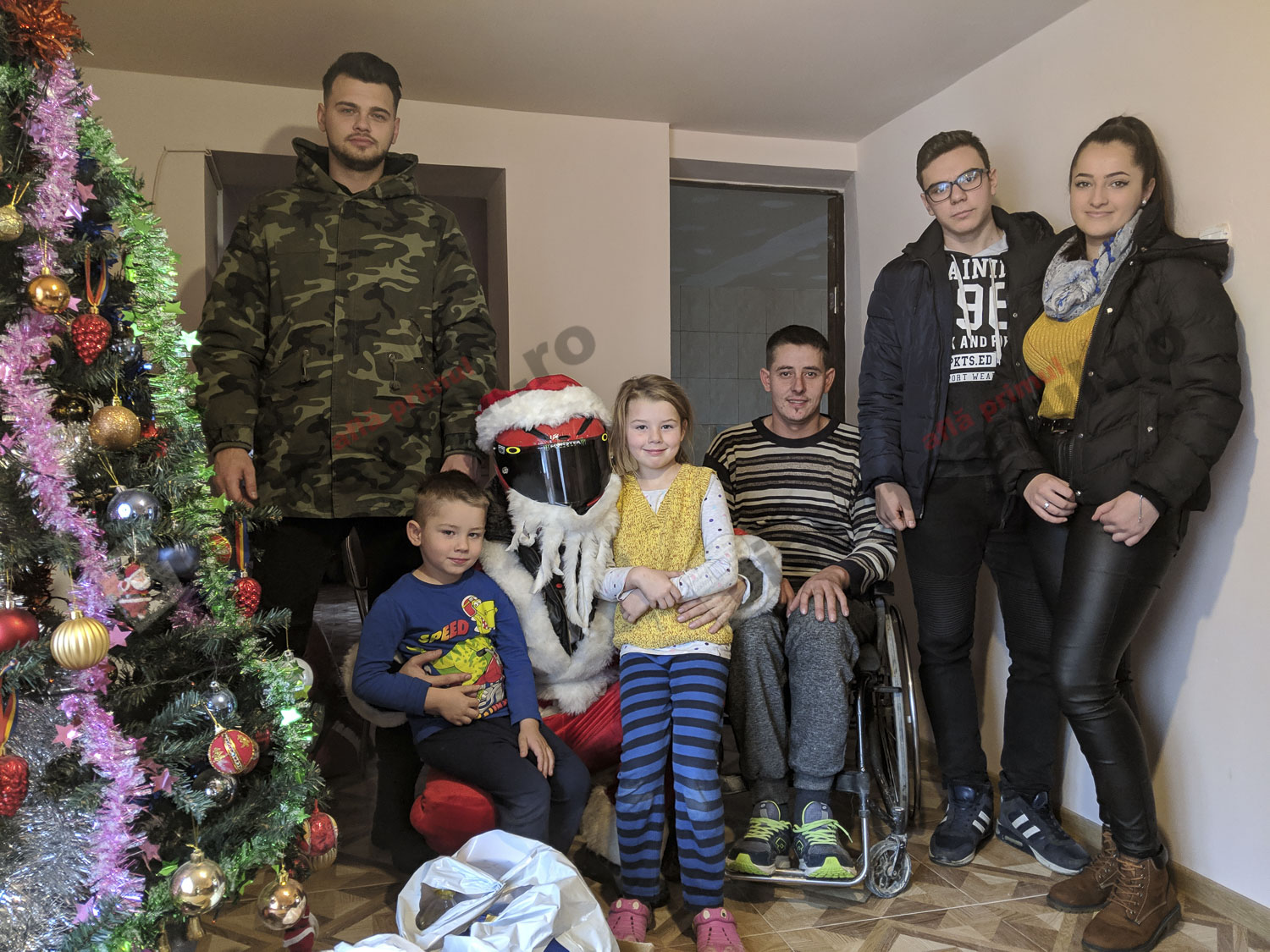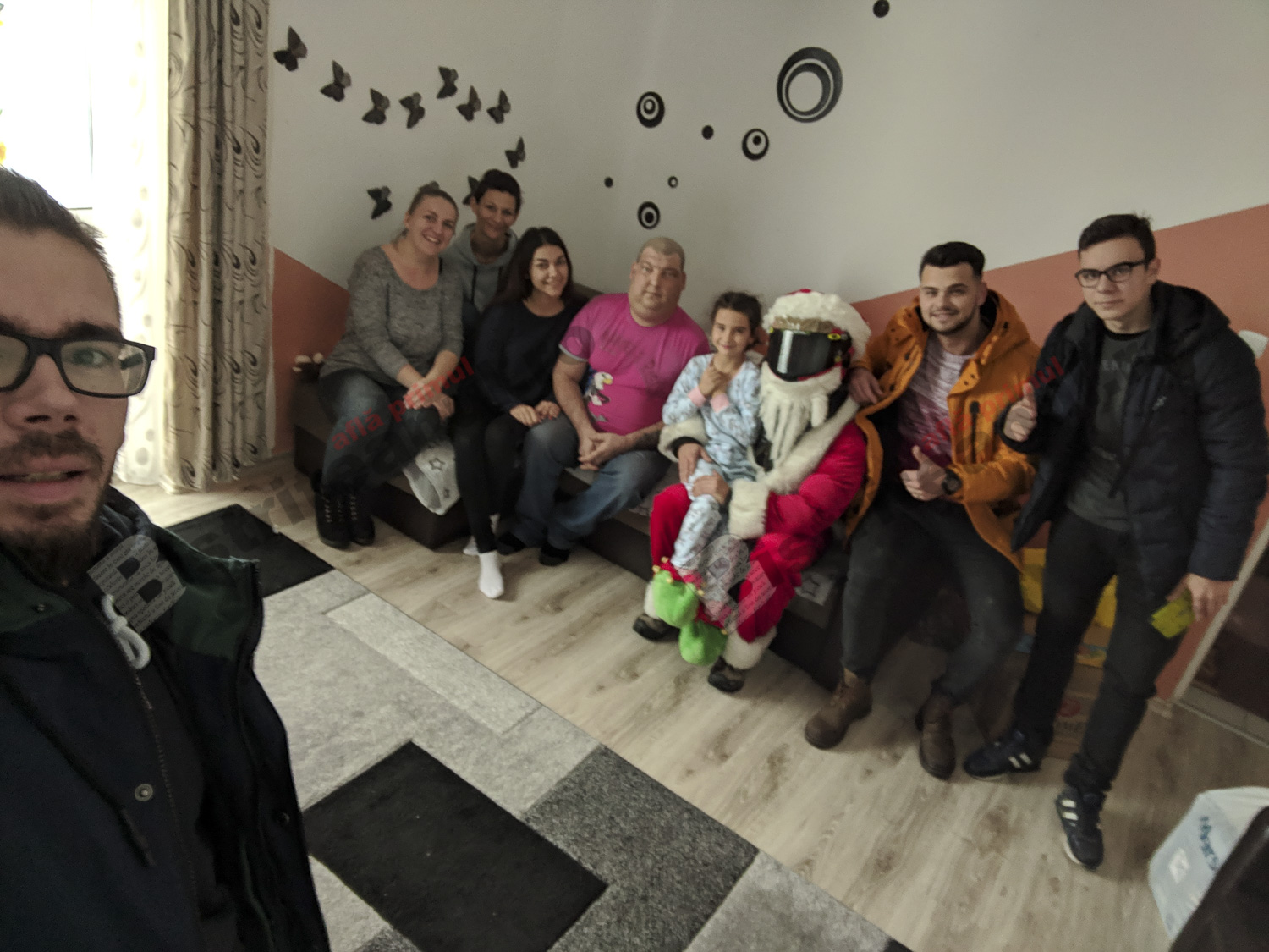 Primul caz prezentat a fost cel al familiei Nica. Alexandra a început să plângă atunci când ne-a văzut, exprimând: „Nu am crezut că există atâția oameni buni!”. Ne-a spus că a fost copleșită de ajutorul primit de la atââââția oameni. Alesia a plâns și ea, de bucurie că a putut să stea în brațe la Moșul cel tânăr, venit cu motocicleta. Le-am dus daruri și 100 de lei, aduși de cineva la cantină.