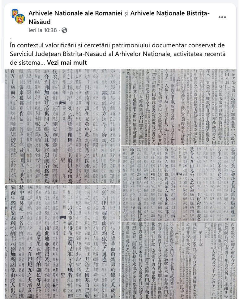 Încă o descoperire remarcabilă, la Arhivele Naționale Bistrița-Năsăud! Este vorba despre cinci documente redactate în limba chineză, realizate prin tehnica xilografiei. Unul dintre acestea este datat în secolul al XVI-lea (cca. 1540) și redă un text filozofic de inspirație confucianistă. În xilografie se evocă ideea că „la 50 de ani omul înțelege voia Cerului”…