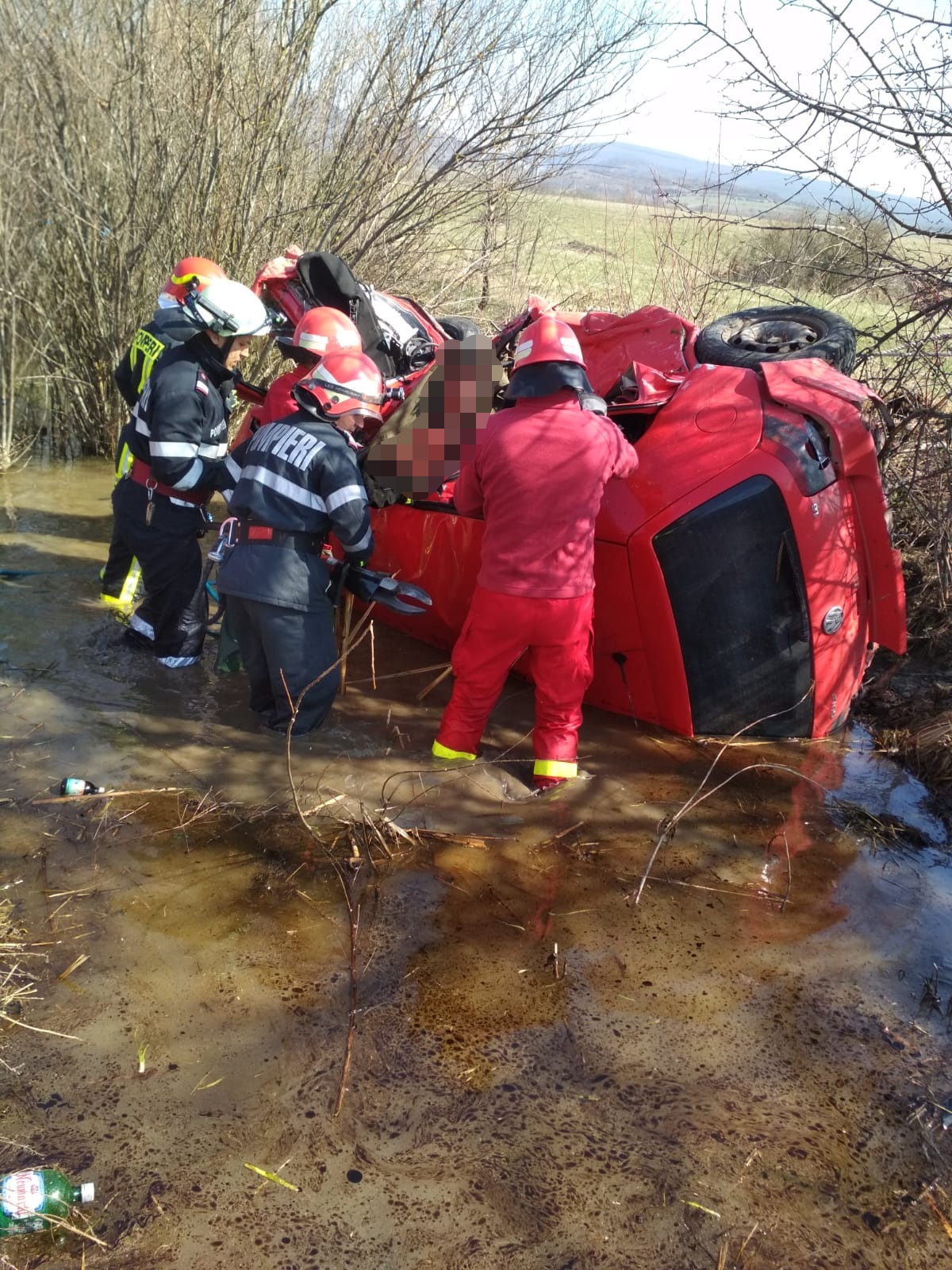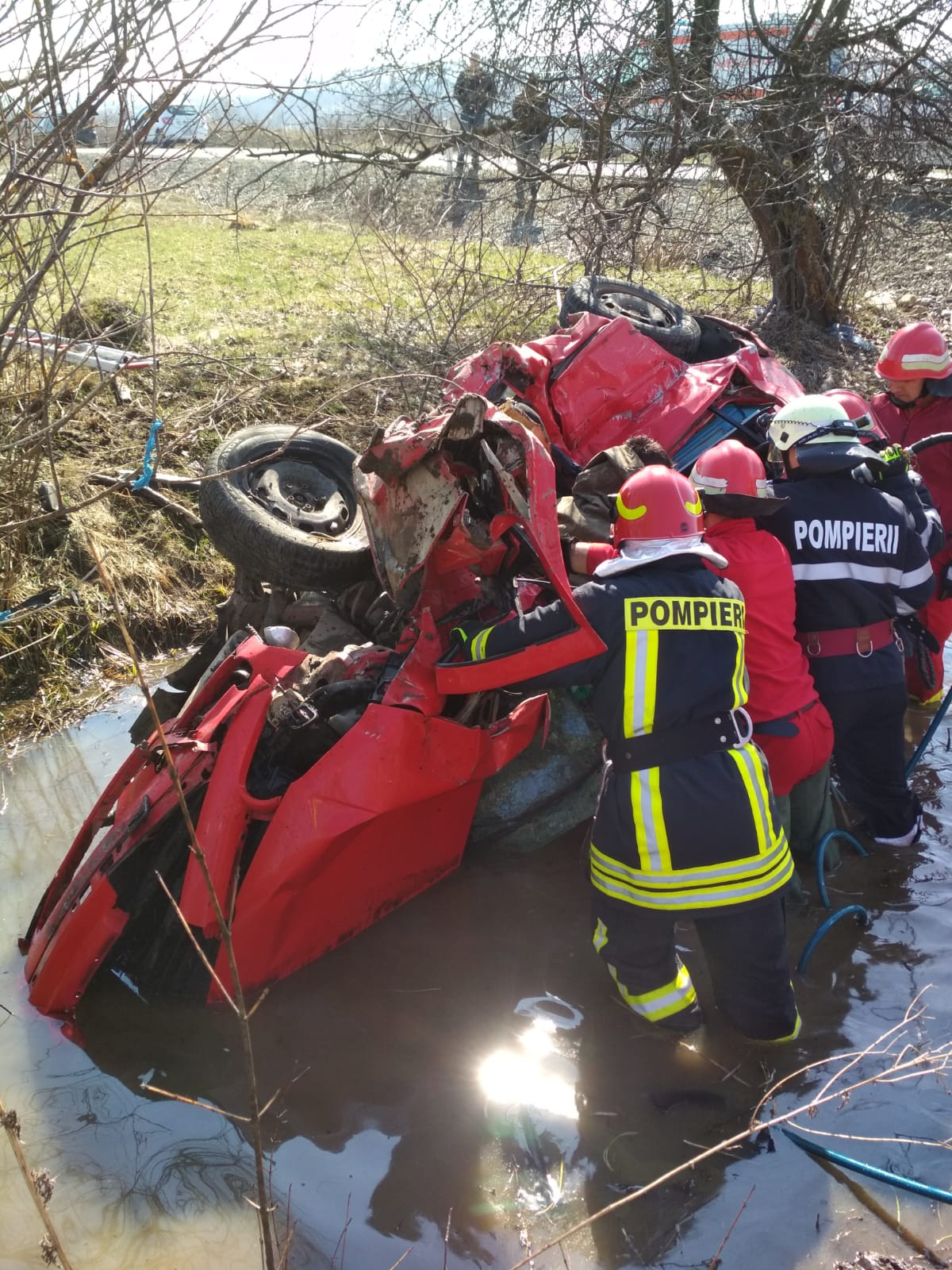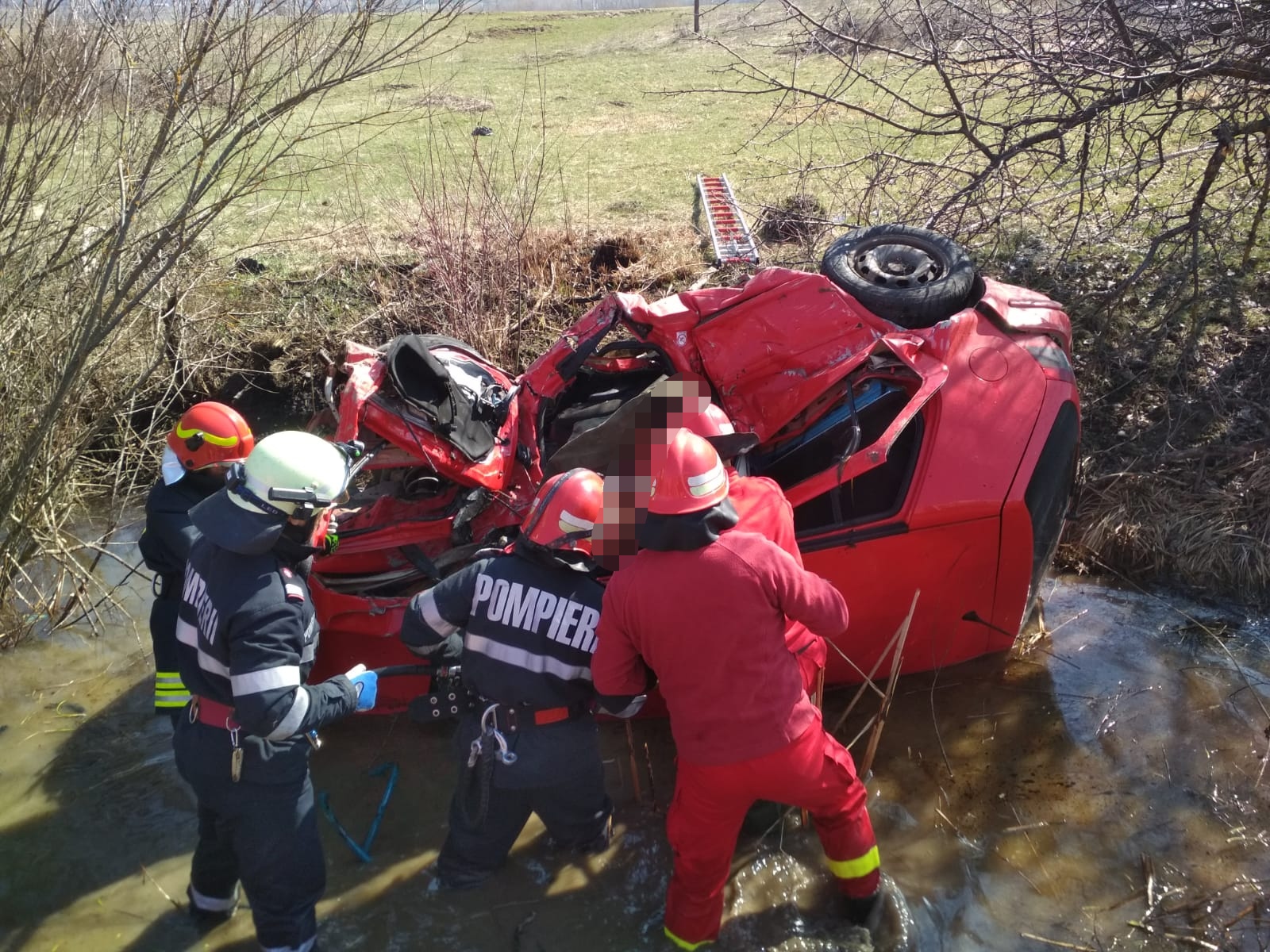 Mașina a ajuns cu roțile în sus în pârâu, iar cei doi tineri din interior au rămas încarcerați între fiarele contorsionate ale acesteia, având nevoie de ajutorul pompierilor militari pentru a se elibera.
