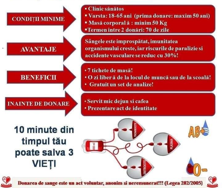 Cei care pot dona, orice grupă de sânge- sunt așteptați la Centrul de Transfuzii Sanguine Bistrița, pe strada Nicolae Bălcescu nr 15, de luni până vineri între orele 07.30 – 13.00.