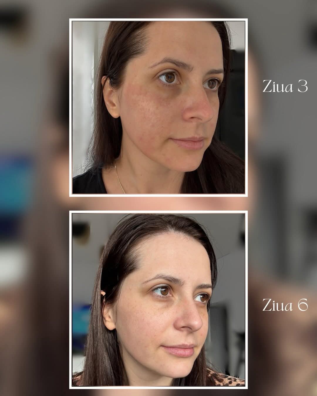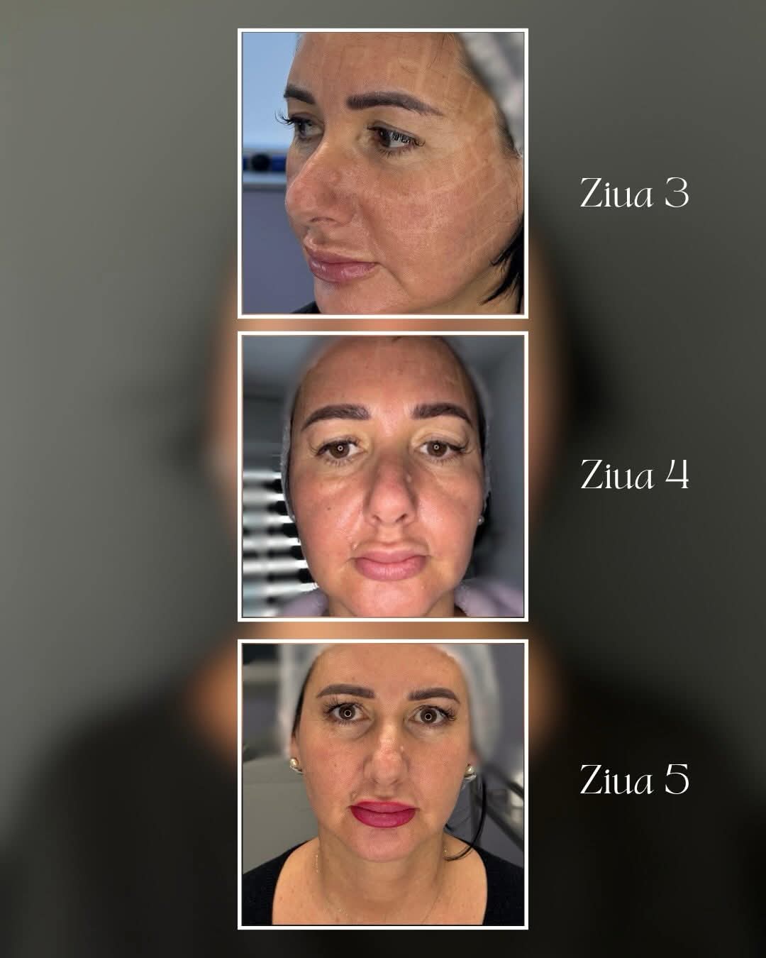 - acceptă o perioadă de recuperare de 3–5–7 zile, în funcție de intensitate (de la roșeața discretă și edem, la cruste și descuamare)