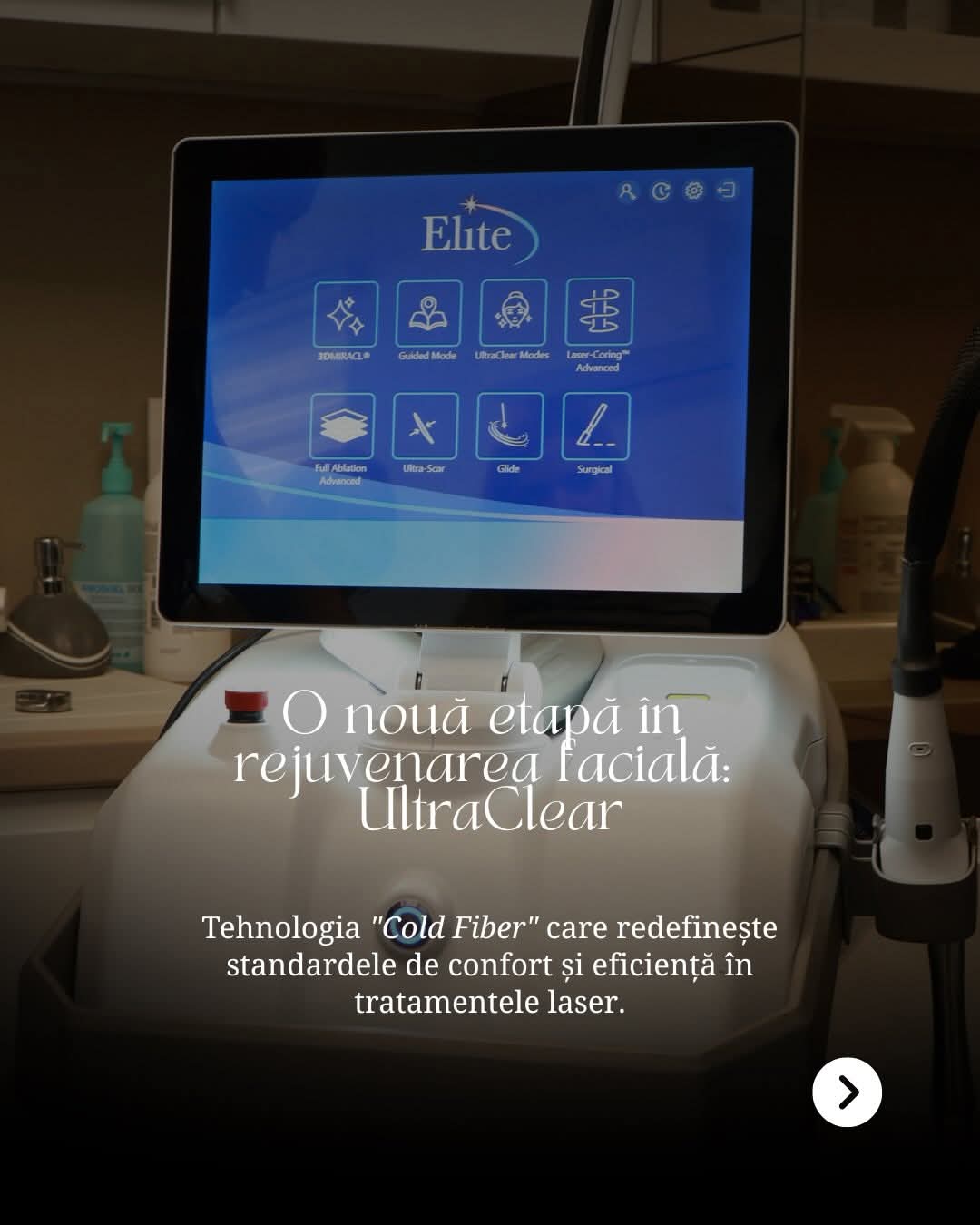 În această ecuație intră UltraClear – o platformă laser cold fiber, cu o lungime de undă de 2910 nm, descrisă de producător drept „laser fracționat rece”, gândită să livreze rezultate de resurfacing cu mai puțina difuzie termică și, în multe cazuri, cu downtime redus, inclusiv la fototipuri mai închise.