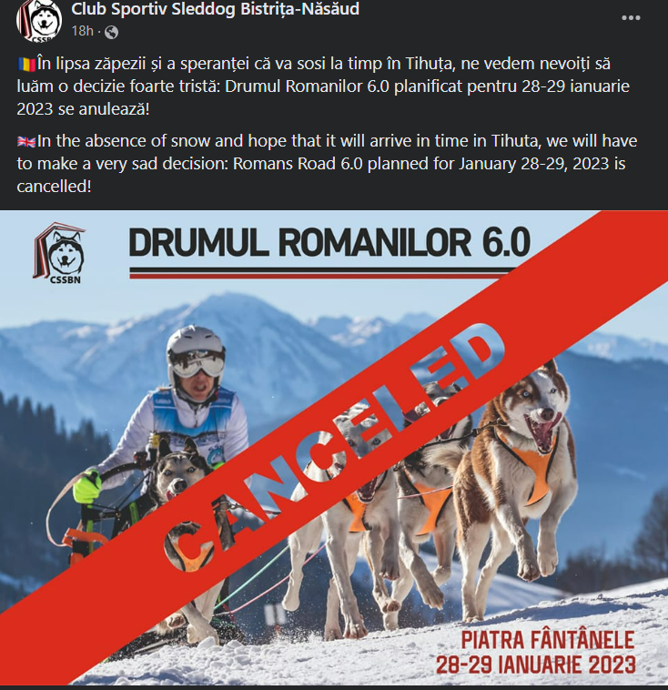 Drumul Romanilor 6.0, competiția de atelaje trase de câini, s-a anulat. Anunțul organizatorilor vine pe fondul lipsei de zăpadă chiar și din zona montană. Evenimentul ar fi avut loc între 28 și 29 ianuarie.