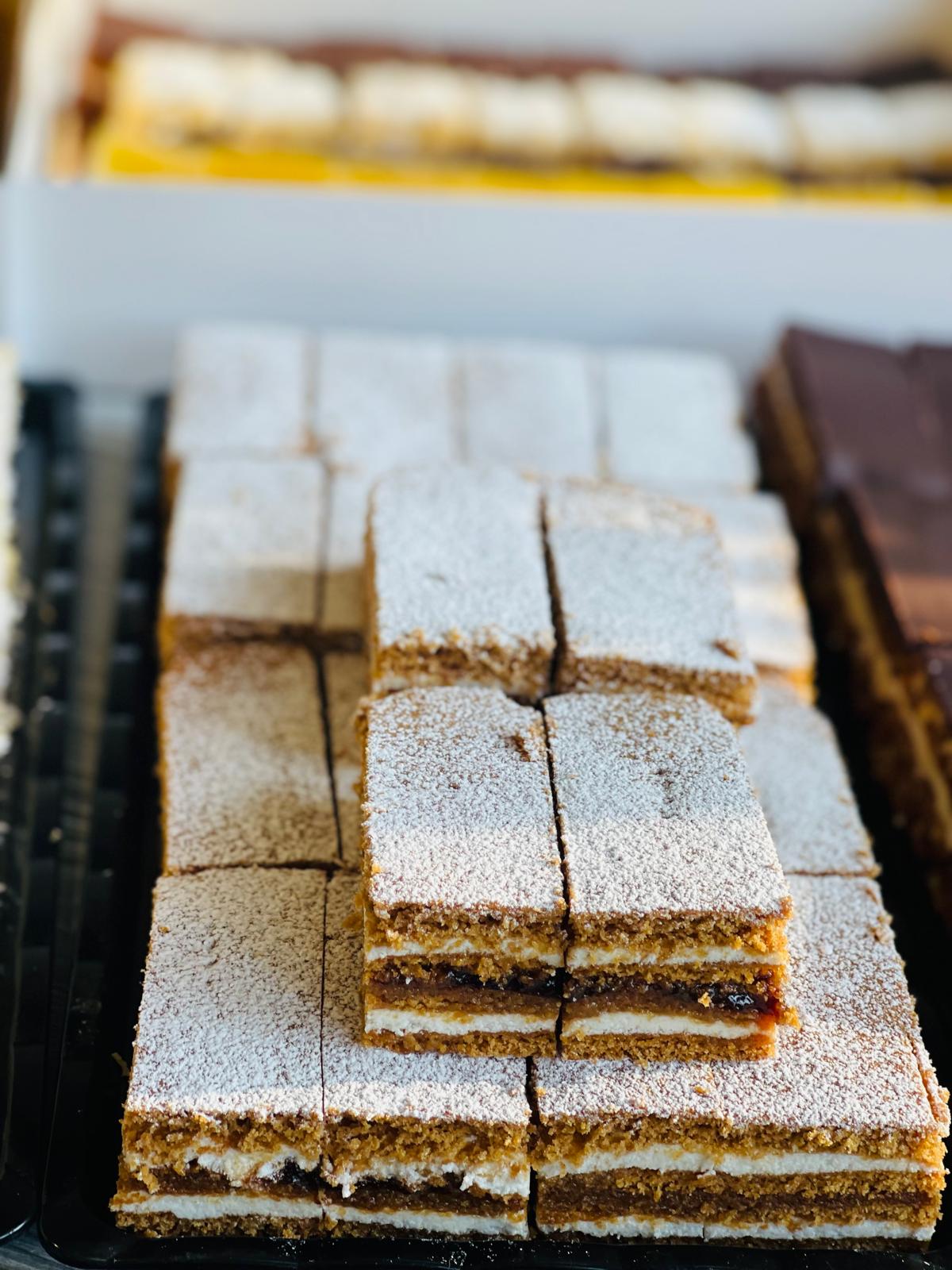 Sortimentele pregătite cu drag, pentru voi, sunt Albinița (foi caramelizate cu miere, cremă de griș și dulceață de prune bistrițene făcută în casă), Snickers (caramel, ciocolată, arahide), Fanta (cremă de brânză, blat de ciocolată, jeleu de portocale ), Cioco/cafea (blat cu cafea, crocant de ciocolată, cremă de ciocolată, glazură Sacher) și Minieclere cu fistic (umplutură de fistic, glazură de fistic).