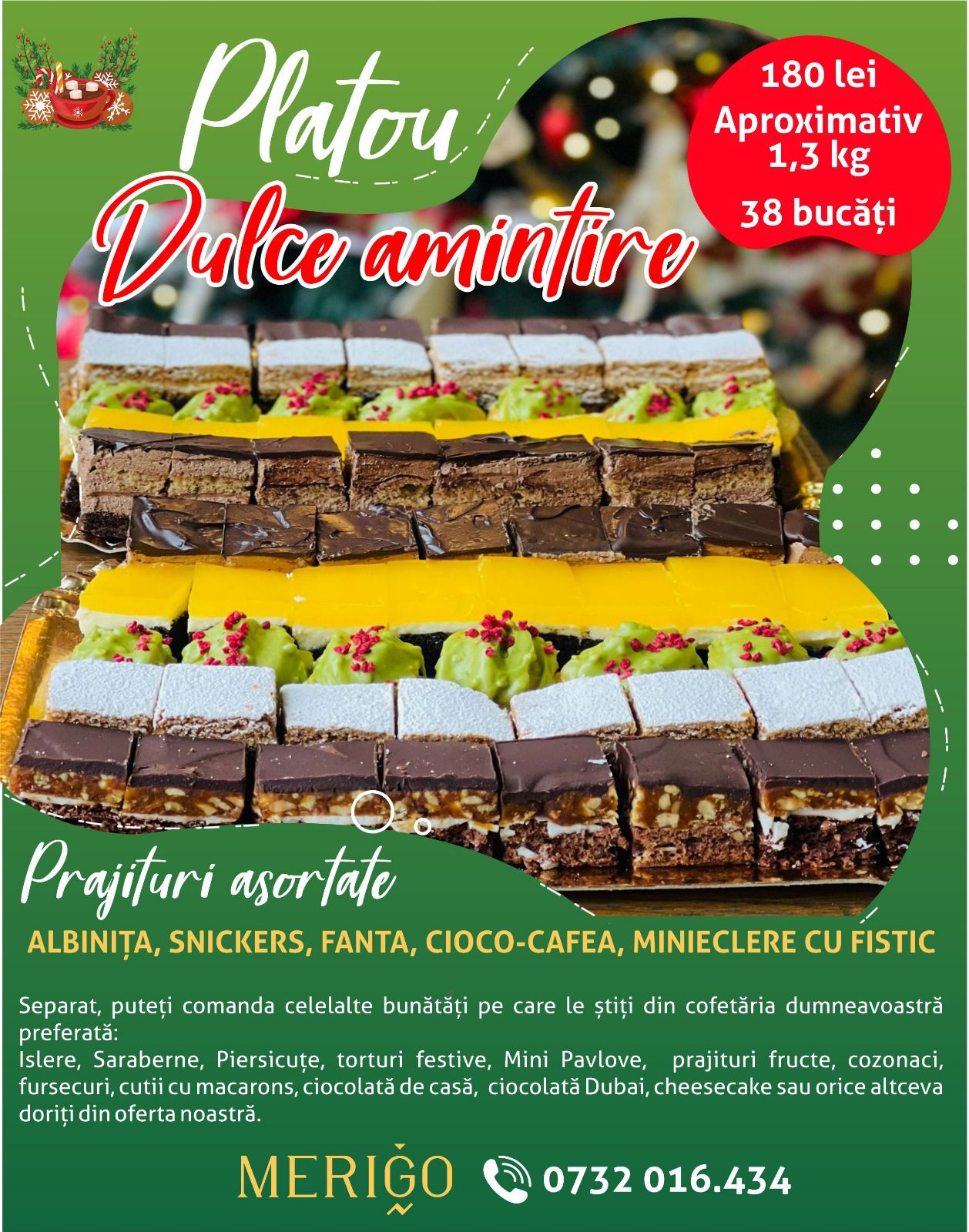 Se apropie cu pași repezi cea mai frumoasă perioadă a anului, iar Merigo a deschis lista de comenzi dulci pentru Crăciun! Special pentru voi, maeștrii cofetari au pregătit un platou deosebit, cu prăjituri asortate – “Dulce Amintire”, creat cu suflet, pentru a aduce pe masa voastră exact acea căldură și acele amintiri delicioase, din serile de sărbătoare, pline de iubire, ale copilăriei.