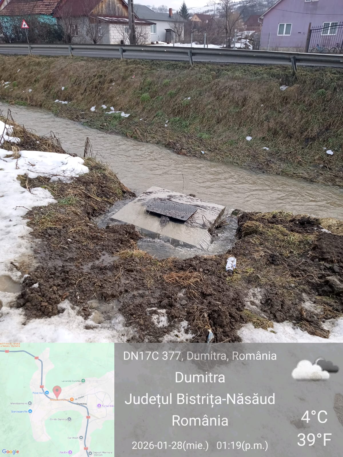 ”În urma controlului neplanificat efectuat în data de 28.01.2026 în comuna Dumitra, am constatat că apele uzate fecaloid menajere împreună cu infiltrațiile datorate apelor pluviale cu aportul apelor provenite din topirea zăpezii, debușau, din cămine deversandu-se în șanțurile de garda, apoi în Valea Aurului și ulterior în pârâul Rosua. Deversarea a avut loc din 3 cămine poziționate fiecare în imediata apropiere a celor 5 stații de pompare existente în comuna Dumitra, localitățile Dumitra și Cepari” a transmis Garda de Mediu BN, astăzi.