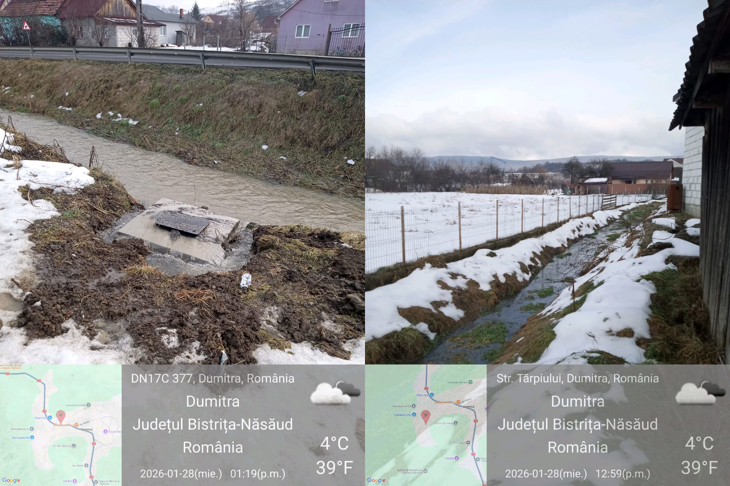 ”În urma controlului neplanificat efectuat în data de 28.01.2026 în comuna Dumitra, am constatat că apele uzate fecaloid menajere împreună cu infiltrațiile datorate apelor pluviale cu aportul apelor provenite din topirea zăpezii, debușau, din cămine deversandu-se în șanțurile de garda, apoi în Valea Aurului și ulterior în pârâul Rosua. Deversarea a avut loc din 3 cămine poziționate fiecare în imediata apropiere a celor 5 stații de pompare existente în comuna Dumitra, localitățile Dumitra și Cepari” a transmis Garda de Mediu BN, astăzi.
