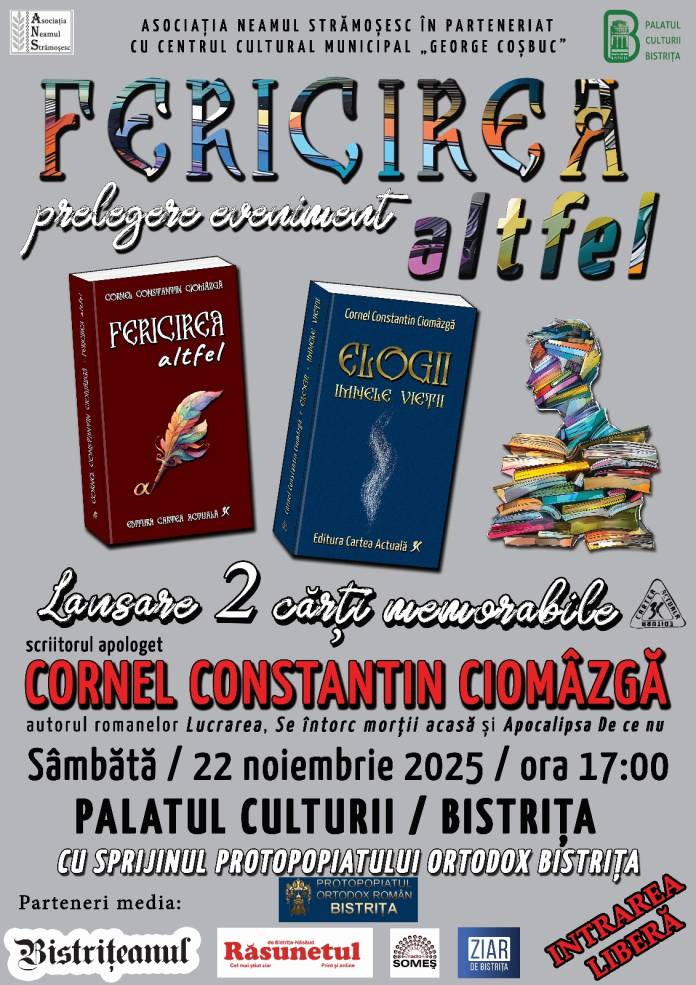 Scriitorul apologet Cornel Constantin Ciomâzgă revine la Bistrița, în acest sfârșit de săptămână: sâmbătă, 22 noiembrie 2025, de la ora 17:00, la Palatul Culturii, acesta va susține o prelegere memorabilă intitulată FERICIREA ALTFEL. Cu acest prilej vor fi prezentate și cele mai noi apariții editoriale ale prof. Ciomâzgă: Elogii – Imnele vieții și Fericirea altfel.
