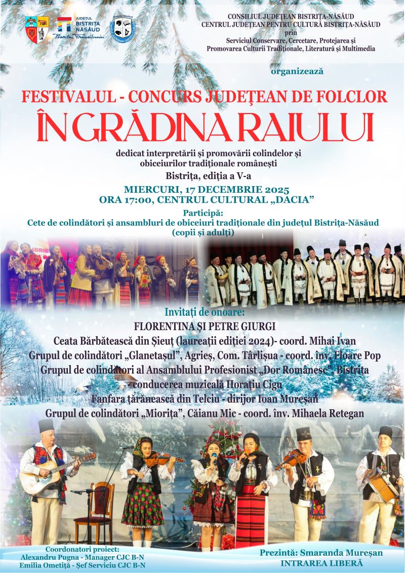 Festivalul concurs de folclor „În grădina Raiului” are loc pe 17 decembrie, de la ora 17.00, la Centrul Cultural Dacia. Evenimentul este dedicat interpretării și promovării colindelor și obiceiurilor tradiționale românești.