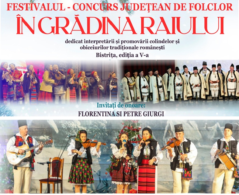 Cete de colindători și ansambluri de obiceiuri tradiționale din Bistrița-Năsăud, copii, tineri și adulți vor anima din nou scena la Centrul Cultural Dacia. Aici se desfășoară, săptămâna viitoare, ediția a V-a a Festivalului concurs „În grădina Raiului”.