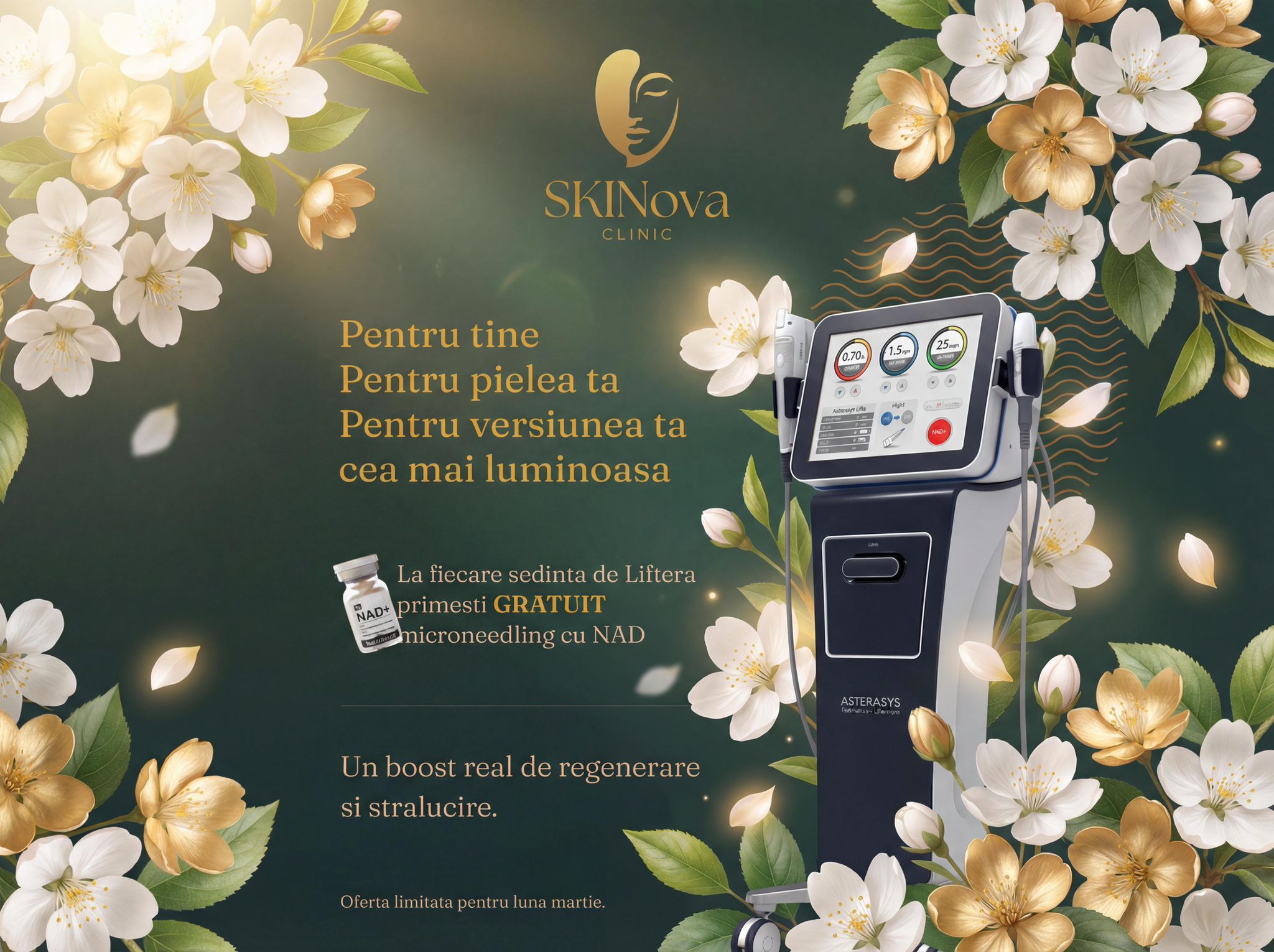 Cea mai nouă clinică de dermatologie și estetică medicală din Bistrița – Clinica Skinova – oferă doamnelor și domnișoarelor un cadou, în luna Martie. Pentru că starea de bine vine din interior și de la cum te simți în pielea ta, fiecare tratament cu Morpheus sau de rejuvenare vaginală cu radiofrecvența VOTIVA au 20 la sută DISCOUNT. Mai mult, la ședințele de regenerare a pielii și strălucire cu LIFTERA primești CADOU microneedling cu NAD. Un răsfăț spectaculos pentru pielea ta!
