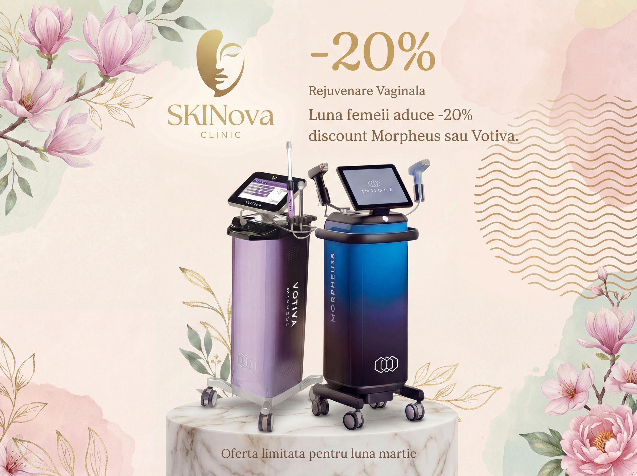 Clientele care vor trece pragul Clinicii Skinova de pe Drumul Dumitrei Vechi, nr. 33, în luna Martie, pentru o procedură de rejuvenare vaginală, vor primi 20 la sută discount. Indiferent dacă vor alege procedura cu liderul în estetică medicală MORPHEUS sau VOTIVA – altă tehnologie de top pe care o găsiți doar la Clinica Skinova.